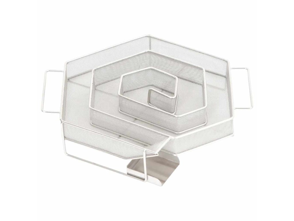 - Generátor studeného kouře: Stačí naplnit pilinami a zapálit čajovou svíčkou, dokud piliny nezačnou měnit barvu. Vyjměte čajovou svíčku a umístěte generátor kouře do udírny. Kompaktní šestihranná mřížka umožňuje rovnoměrné a pomalé hoření štěpků po dobu až 8 hodin.