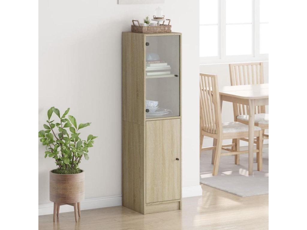 - Praktická skleněná dvířka: Udržujte místnost bez nepořádku tím, že drobné předměty skryjete za dvířka této skříňky. Skleněná dvířka navíc umožňují nahlížet dovnitř skříně a krásně vystavit předměty.