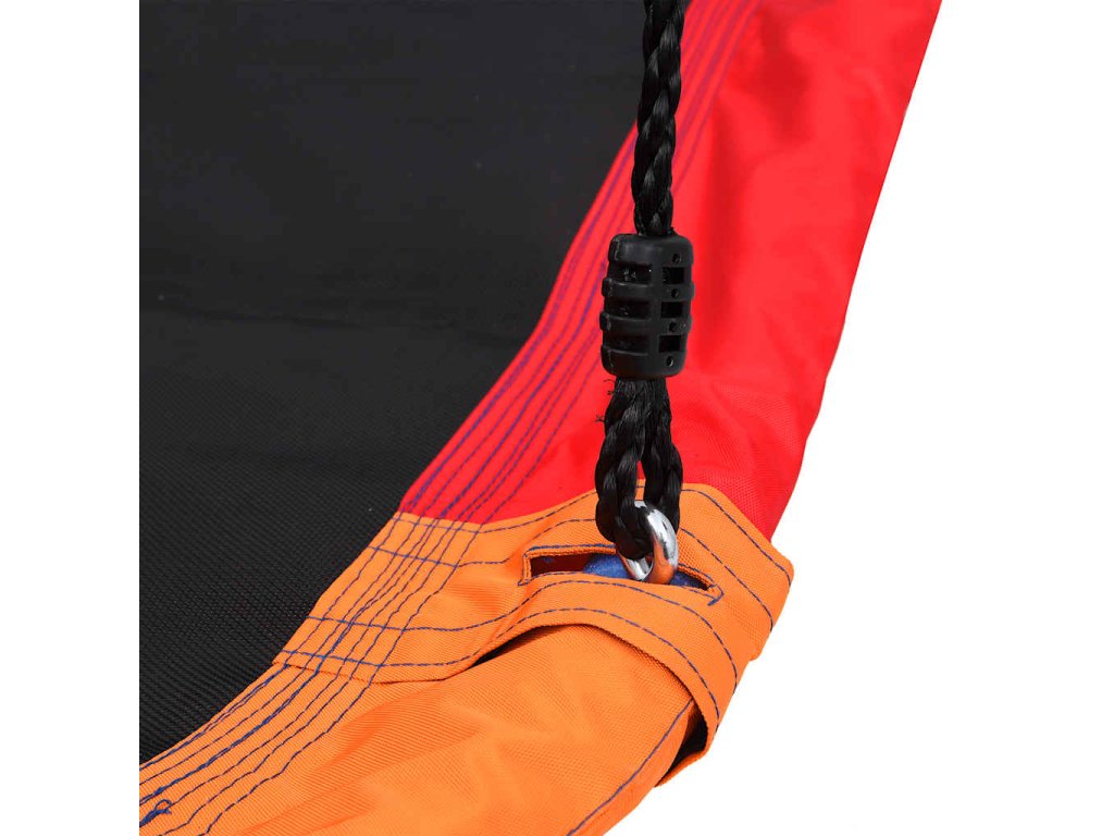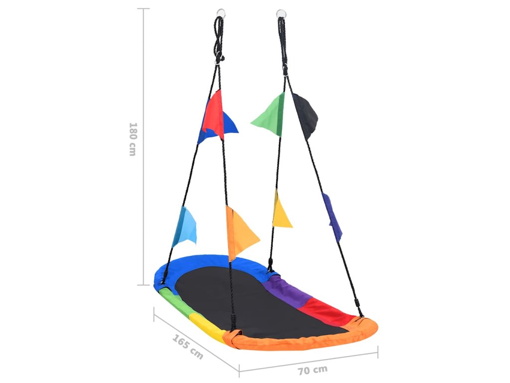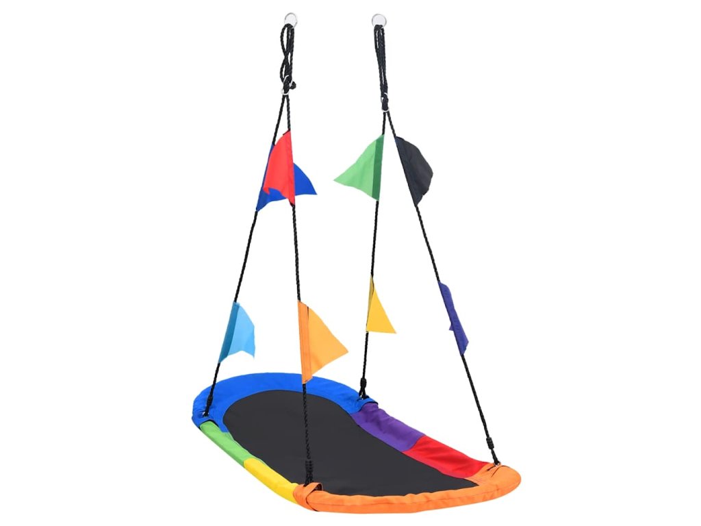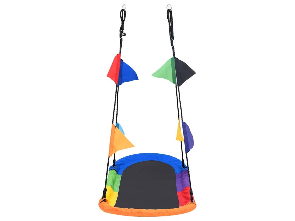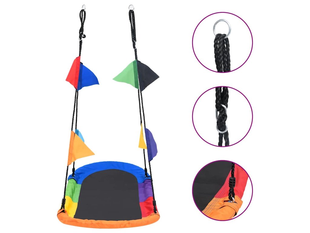 Houpačka na strom má ocelový rám obalený měkkým pěnovým polstrováním, aby byla jak odolná, tak pohodlná. Horní vrstva je ušitá z šestibarevné látky, která se neopotřebovává a je voděodolná a má vylepšenou nosnost. Černé sedátko houpačky je vyrobené z PP podložky, která se snadno čistí. Osm praporků, zavěšených na provazech, se při pohybu houpačky plápolají dopředu a dozadu, a vytváří tak veselou a hravou atmosféru, aby si děti houpání opravdu užily. Všechny nastavitelné provazy jsou vybavené kroužkem pro pevné zavěšení houpačky a k sedátku jsou připevněné ve čtyřech bodech, což zaručuje rovnoměrný tah na všech stranách, a tím pádem i lepší rovnováhu a bezpečnost.