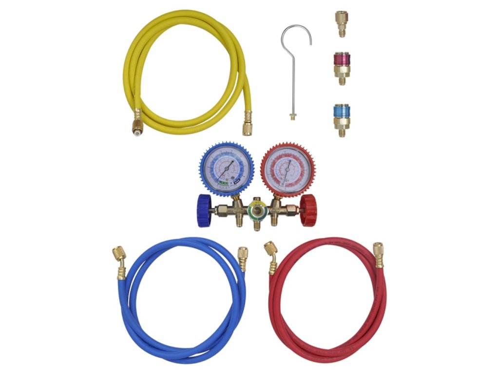 Dvoucestná sada na měření se uplatní při plnění a kontrole klimatizačních systémů, ukáže vám totiž údaje o tlaku v systému. Můžete ji použít na všechny automobilové klimatizace, ale i komerční a domácí klimatizační chladicí systémy. Hodnoty na barevně rozlišených měřidlech lze číst snadno, rychle a přehledně. Aby se nepoškodila, jsou zapuštěná v ochranném plášti. Pomocí vestavěného ocelového háčku je také bez námahy zavěsíte. Sada na měření má odolnou konstrukci.