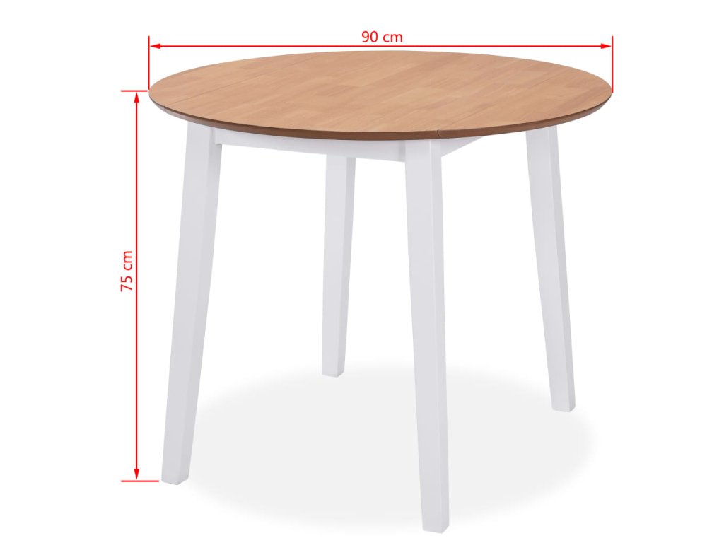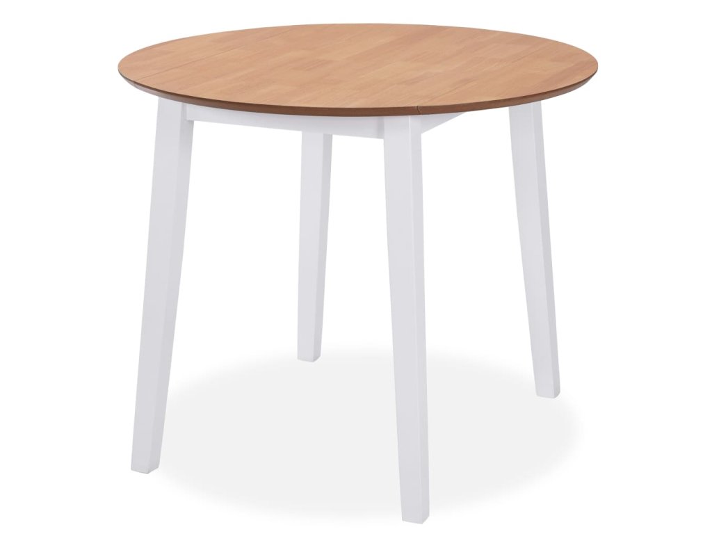 Tento jídelní set má klasický design v sofistikované kombinaci bílé barvy a přírodního dřeva. MDF usnadňuje čištění stolu a masivní kaučukovníkové dřevo přispívá ke stabilitě noh. Dřevo bylo opatřeno olejovým nátěrem, který mu dodává bohatou, teplou barvu. Strany jídelního stolu mohou být sklopeny dolů a židle se dají zasunout pod stůl, abyste ušetřili místo, když set zrovna nepoužíváte.