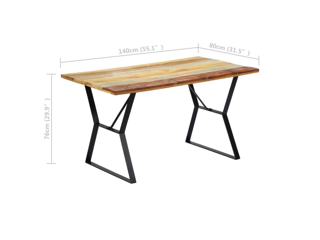 Tento vintage jídelní stůl je vyrobený z masivního recyklovaného dřeva, které pochází z trámů, podlah a podpěrných nosníků ze starých budov určených k demolici. Může tedy sestávat z celé řady různých druhů dřeva, jako jsou borovice, teak, buk, dub, cedr, mangovník, akácie apod. Recyklované dřevo tak nabývá vlastností všech těchto rozličných typů dřevin. Navíc je již zestárlé, ošlehané a vyschlé, takže se nesmršťuje ani neohýbá. Stůl je celý ručně vyrobený a překrásná kresba dřeva ho činí naprosto jedinečným a lehce odlišným od všech ostatních. Bytelné nohy z železa s práškovým nástřikem mu navíc dodávají na odolnosti. Sestavení jídelního stolu je snadné.