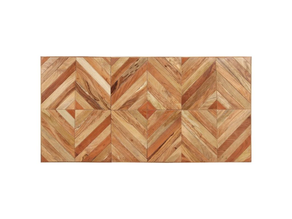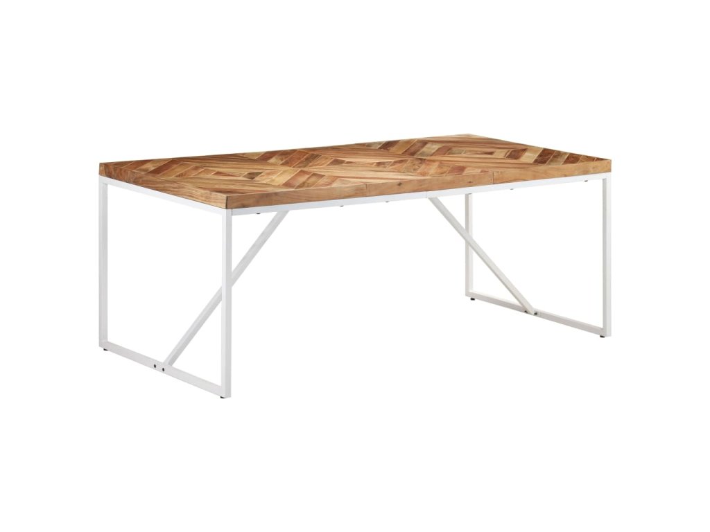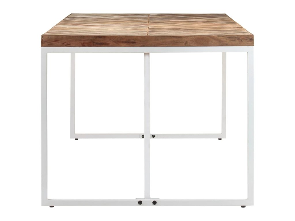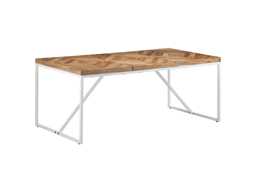Jídelní stůl je ručně vyrobený z masivního akáciového a mangovníkového dřeva, je velmi stabilní a odolný. Bílé, práškově lakované ocelové nohy poskytují extra stabilitu. Robustní deska stolu má chevron a mozaikový design, který je velmi působivým doplňkem do vašeho interiéru. Je také perfektní pro servírování nápojů nebo občerstvení.
