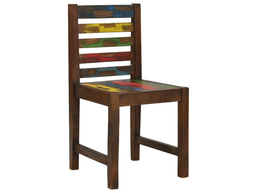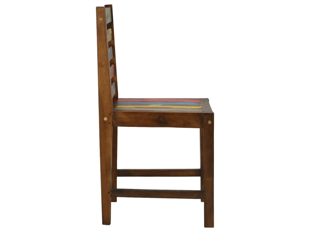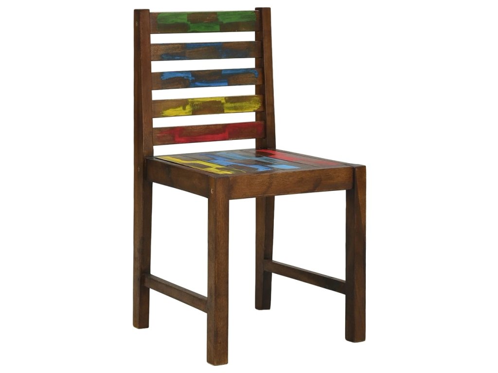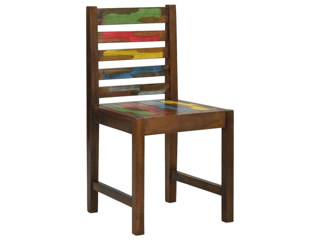 Židle jsou ručně vyrobené z masivního recyklovaného dřeva, a to ze směsi různých typů dřevin, mezi něž patří teak, mangovník, borovice, buk a další. Použité dřevo pochází ze starých továren, kůlen a lodí a představuje fantastický materiál pro výrobu nábytku, který je šetrný k životnímu prostředí. Jelikož je každý kus vyrobený ručně, barevně se liší a narazíte na mnoho odstínů modré, zelené, červené a žluté. To znamená, že každá židle je naprosto jedinečná!