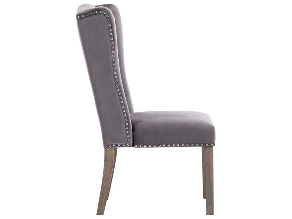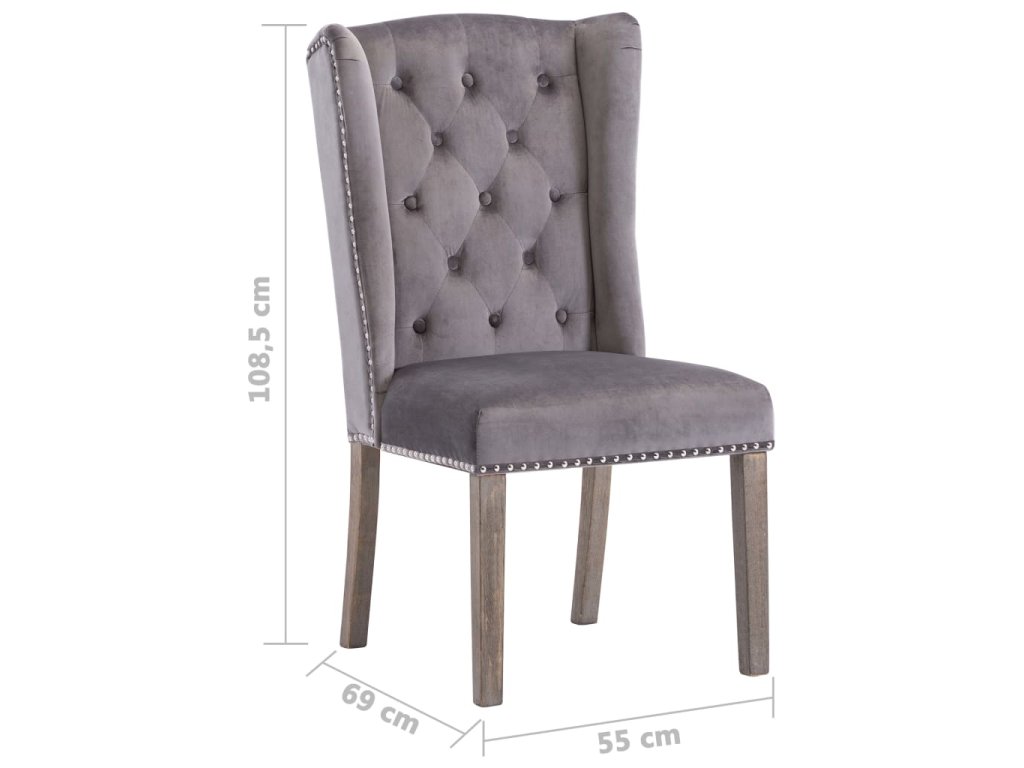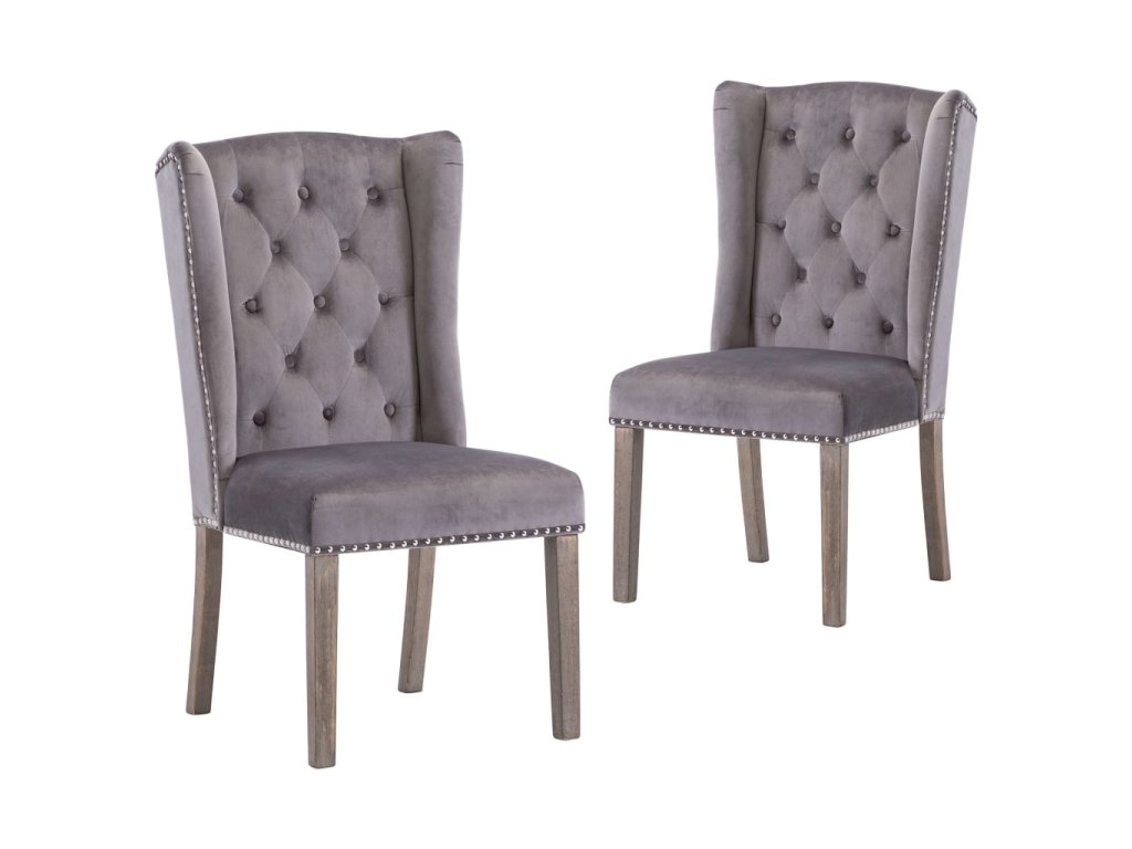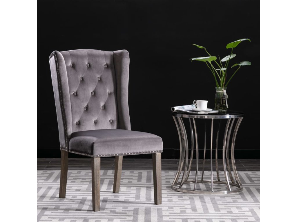 Jídelní židle jsou čalouněné na dotek hebkou sametovou látkou, takže se vám na nich bude moc dobře sedět při stolování, čtení i jen tak u odpočinku. Jejich klasickou krásu zdůrazňují dekorativní knoflíky na opěradle a kovové cvočky podél okrajů. Sedák podepírají nohy z masivního kaučukovníku, židle jsou tedy také stabilní a odolné.