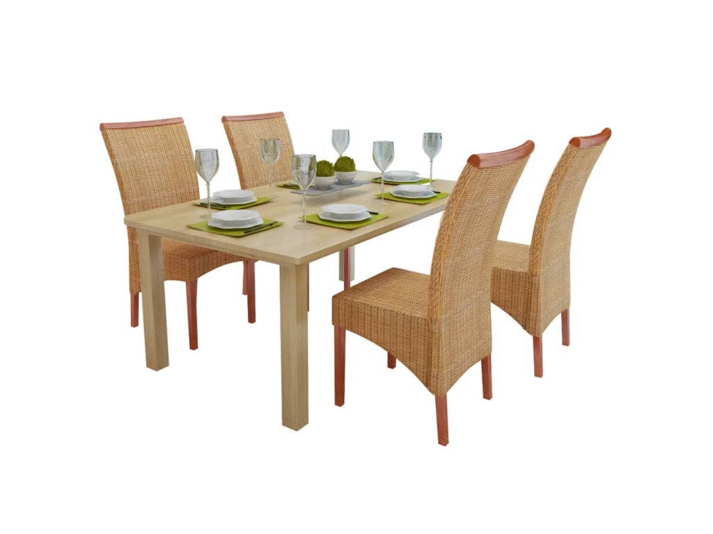 Tato originální sada ratanových jídelních židlí v tropickém stylu má masivní dekorativní pruh a bude skvělým doplňkem vašeho interiéru. Rámy z tvrdého dřeva a výplet z pravého ratanu dodává těmto židlím nejen pevnou strukturu, ale i příjemný vzhled.