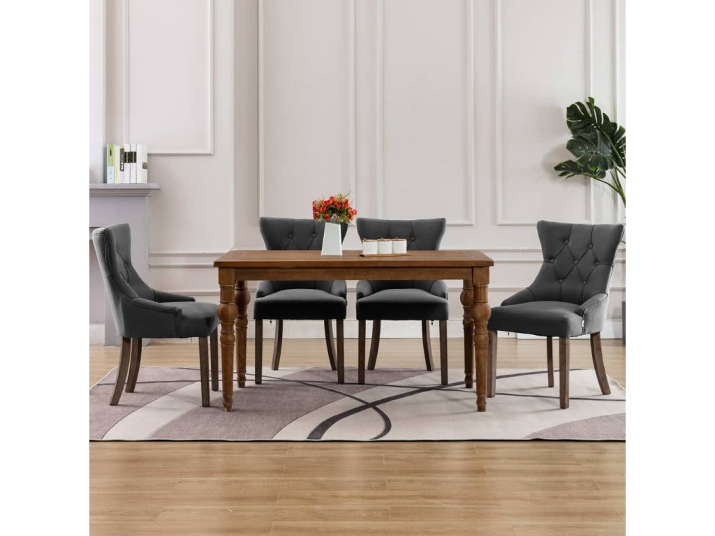 Design s krásnými knoflíky na opěradle těchto jídelních židlí je velmi atraktivní. Kuchyňské židle jsou čalouněné sametem, takže jsou měkké a příjemně se na nich sedí. Jejich silně polstrované sedáky a zaoblená opěradla vám zajistí optimální pohodlí. Nohy z kaučukovníkového dřeva zase přispívají k lepší stabilitě a zaručují židlím výtečnou odolnost.