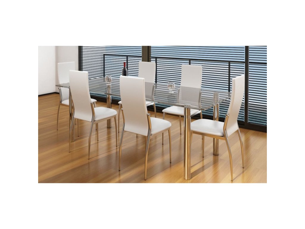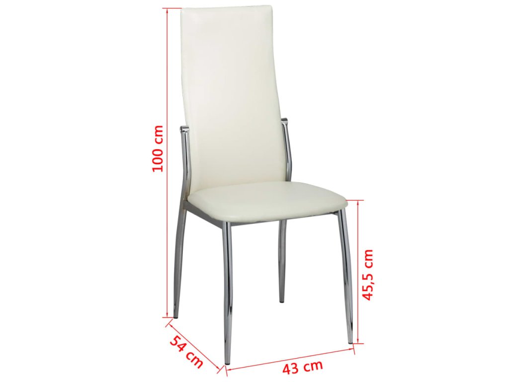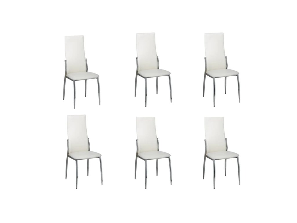 V sadě je 6 moderních jídelních židlí s ergonomickým tvarem, které vám poskytnou více pohodlí. Tyto pohodlné jídelní židle mají vysokou kvalitu a robustní konstrukci. Nohy jsou vyrobené ze stabilního chromu a sedadla jsou z odolné syntetické kůže, která se snadno čistí.