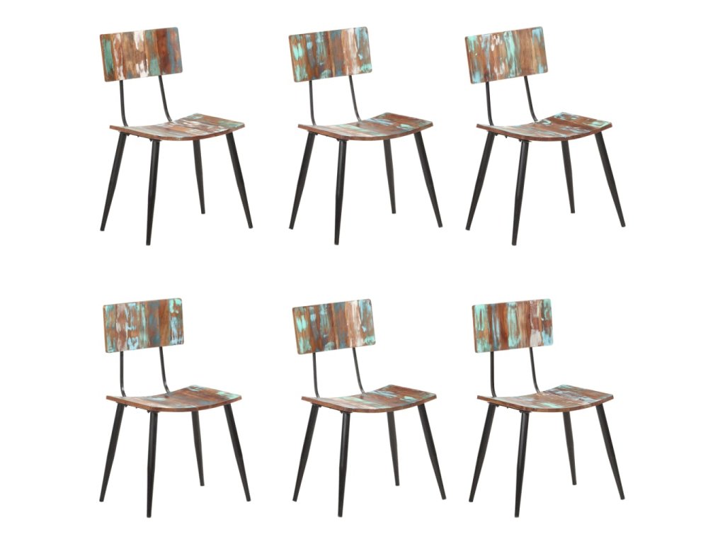 Tyto židle jsou vyrobeny z masivního recyklovaného dřeva, což znamená, že každý kus nábytku je jedinečný a mírně odlišný od ostatních. Nábytek je vyrobený z recyklovaného dřevo, které má charakteristiky různých druhů dřeva, jako je teak, mangovník a akácie. Recyklované dřevo je pevné, stabilní, odolné a krásné. Známky opotřebení a zřetelná kresba dřeva zase vypovídají o bohaté historii a každému kusu dodávají autentický vzhled. Tato sada židlí je ručně vyrobená a každý krok výrobního procesu je prováděn s nejvyšší péčí. Vícebarevná povrchová úprava podtrhuje jejich velkolepý retro styl.