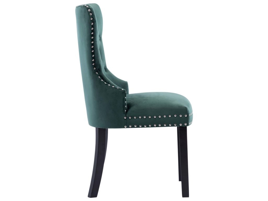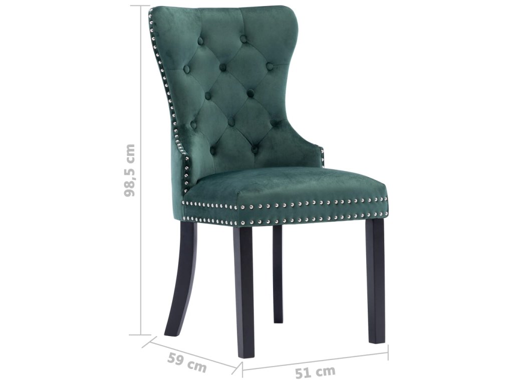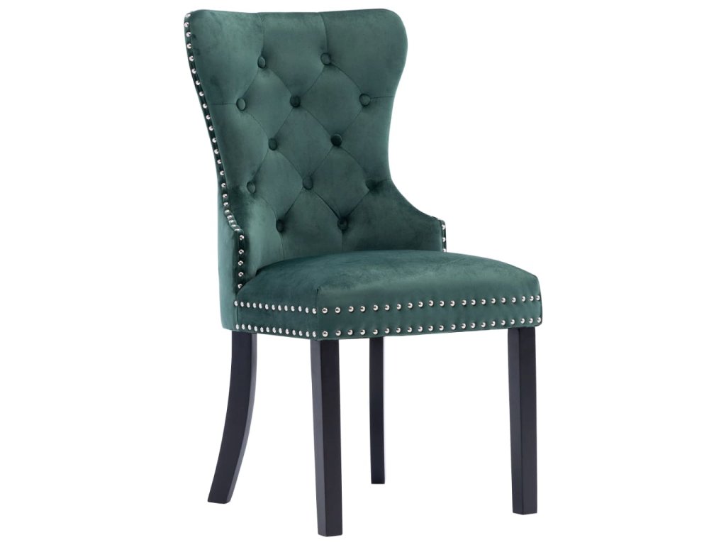 Jídelní židle jsou čalouněné na dotek hebkou sametovou látkou, takže se vám na nich bude moc dobře sedět při stolování, čtení i jen tak u odpočinku. Jejich klasickou krásu zdůrazňují dekorativní knoflíky na opěradle a kovové cvočky podél okrajů. Sedák podepírají nohy z masivního kaučukovníku, židle jsou tedy také stabilní a odolné.
