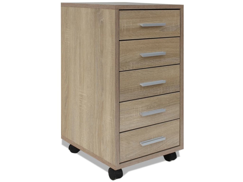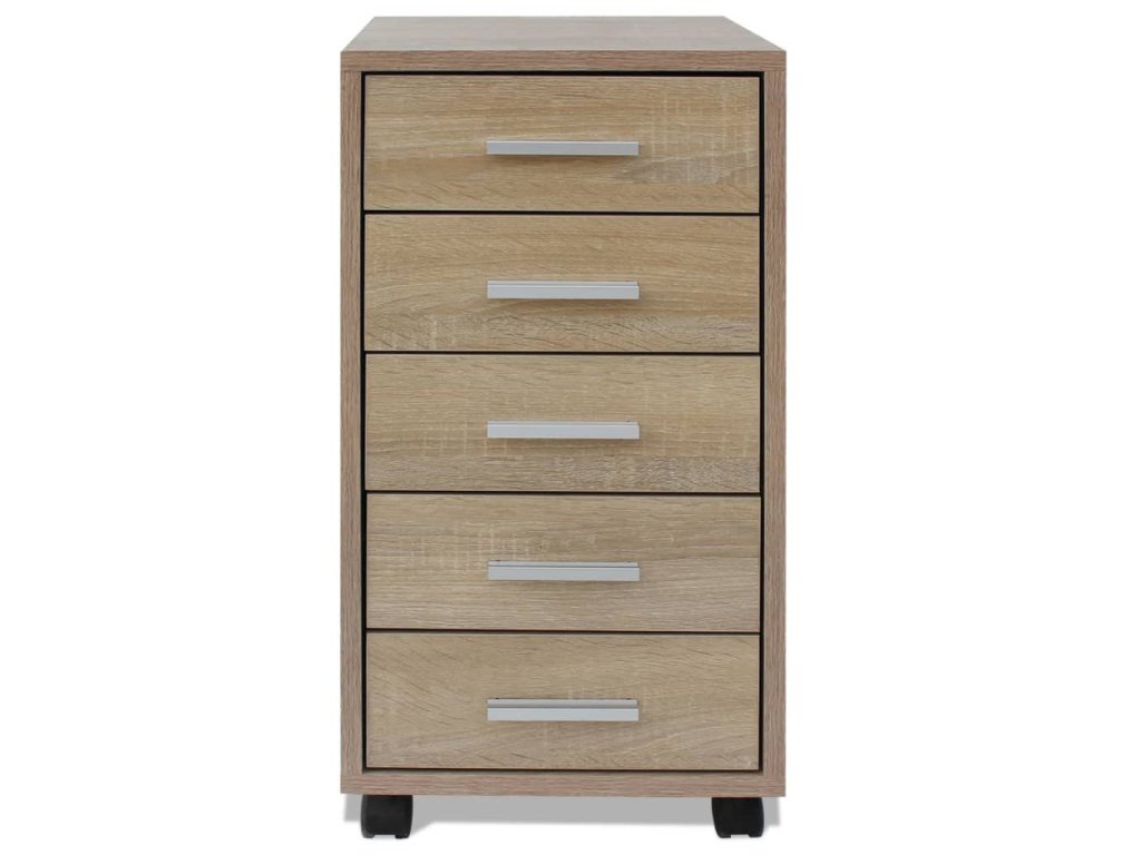 Tato kancelářská skříňka je vyrobená z vysoce kvalitních materiálů a je pevná a odolná. Hliníkové úchytky jí dodávají stylový vzhled. Skříňka má pět zásuvek, které poskytují spoustu úložného prostoru na dokumenty, zápisníky, pera, kancelářské sponky, klíče a další kancelářské potřeby. Díky svým 4 kolečkům se tento díl pod kancelářský stůl dá flexibilně a snadno přemisťovat.