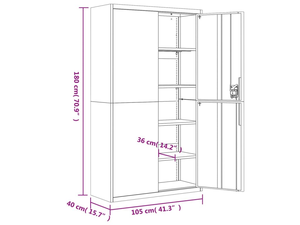 - Nastavitelné police: Skříň je vybavena 4 nastavitelnými policemi, které umožňují přehledné třídění souborů do různých kategorií.