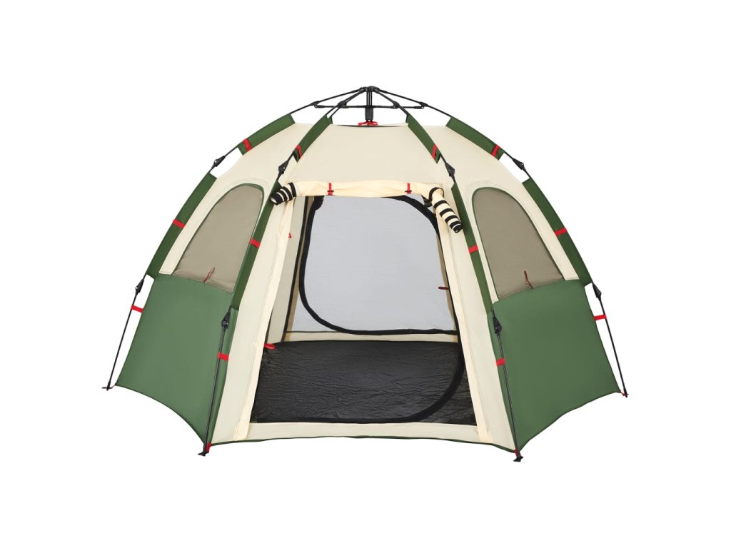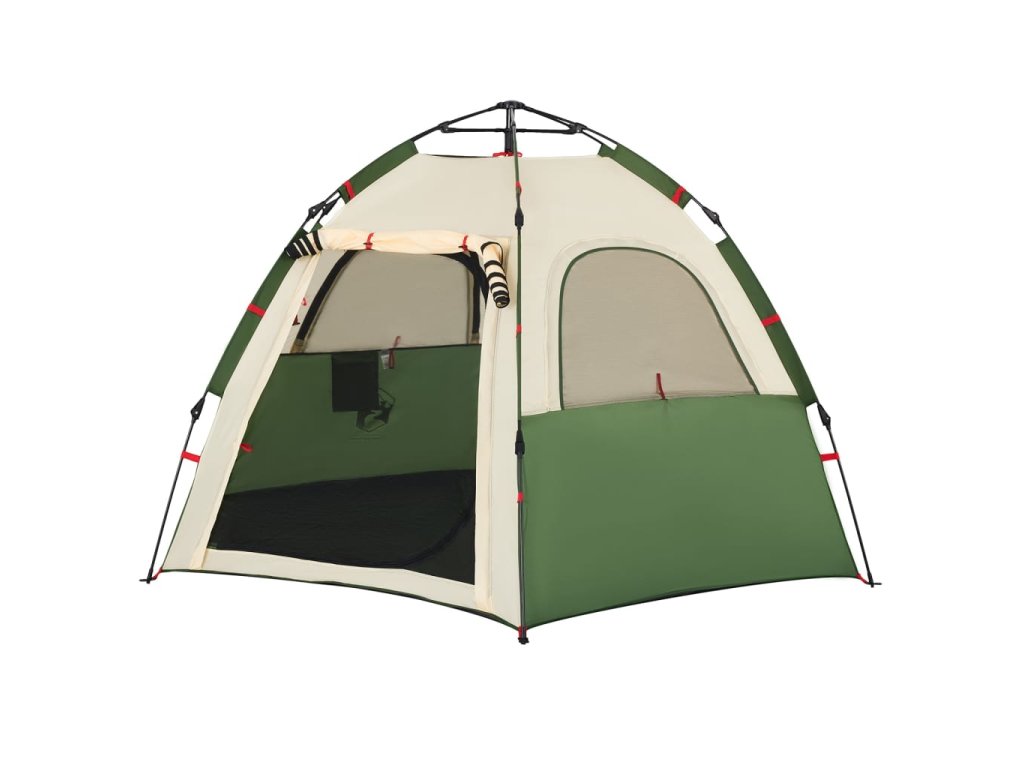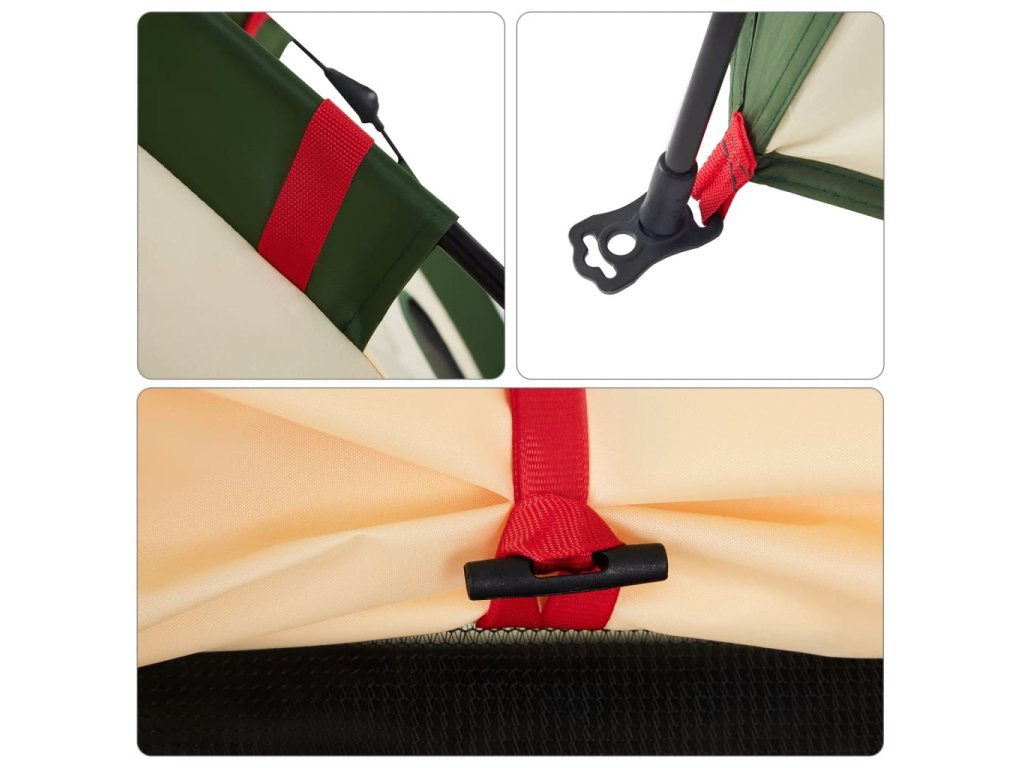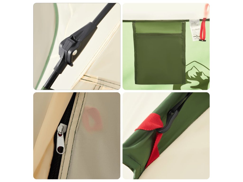 - Rychloupínací systém: Postavte stan snadno a bez námahy pomocí rychloupínacího systému! Stan položte na zem, roztáhněte předem sestavené tyče, dokud nezapadnou na své místo, a vše je hotovo!
