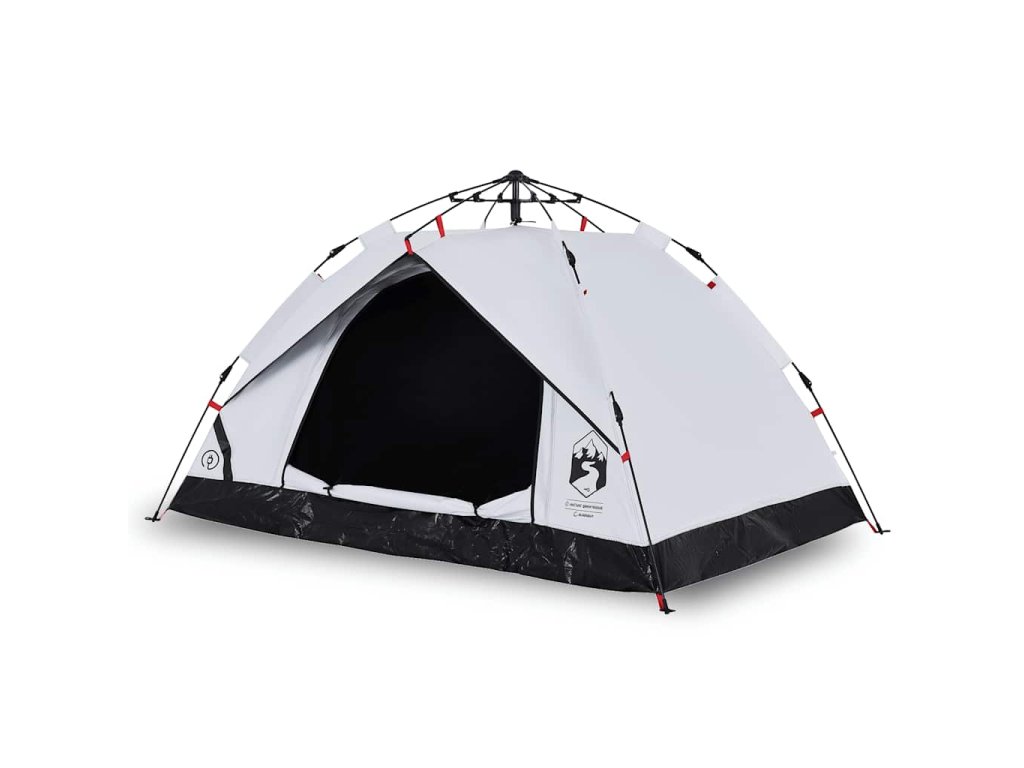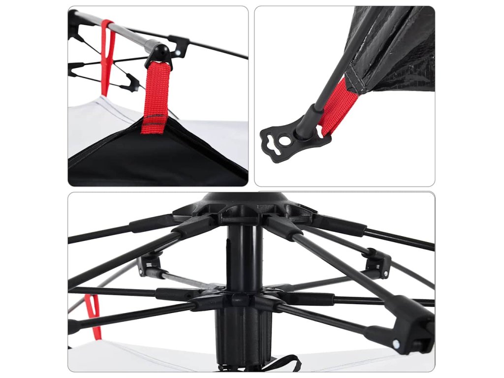 - Rychloupínací systém: Postavte stan snadno a bez námahy pomocí rychloupínacího systému! Stan položte na zem, roztáhněte předem sestavené tyče, dokud nezapadnou na své místo, a vše je hotovo!