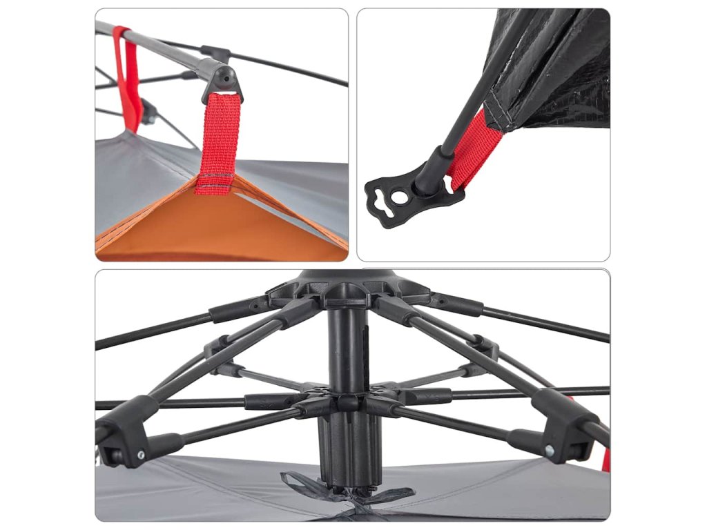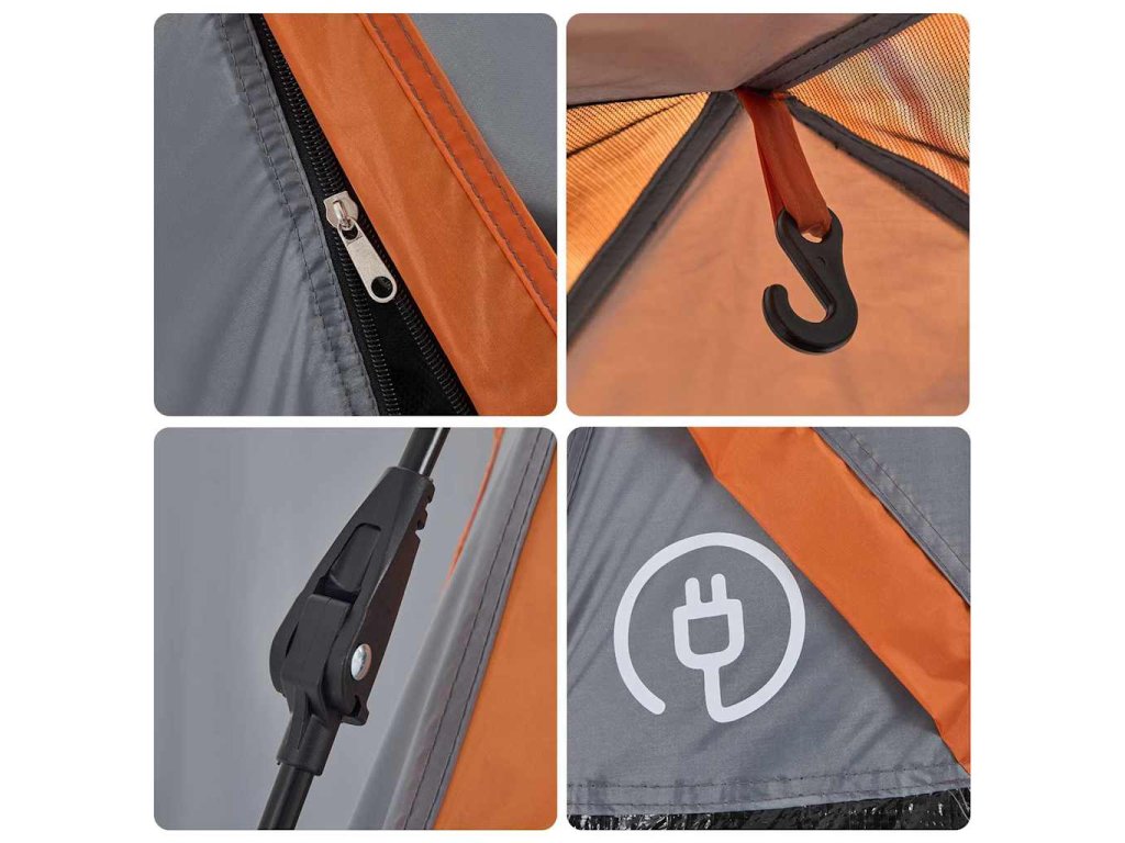 - Rychloupínací systém: Postavte stan snadno a bez námahy pomocí rychloupínacího systému! Stan položte na zem, roztáhněte předem sestavené tyče, dokud nezapadnou na své místo, a vše je hotovo!
