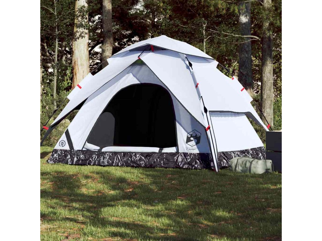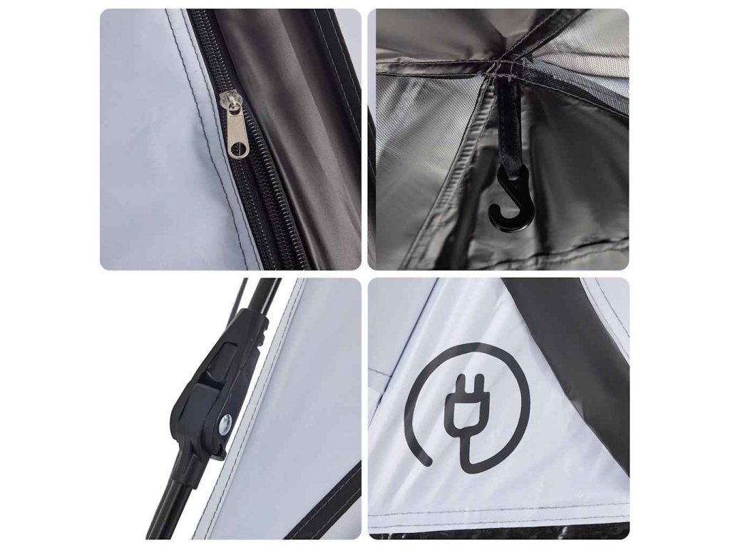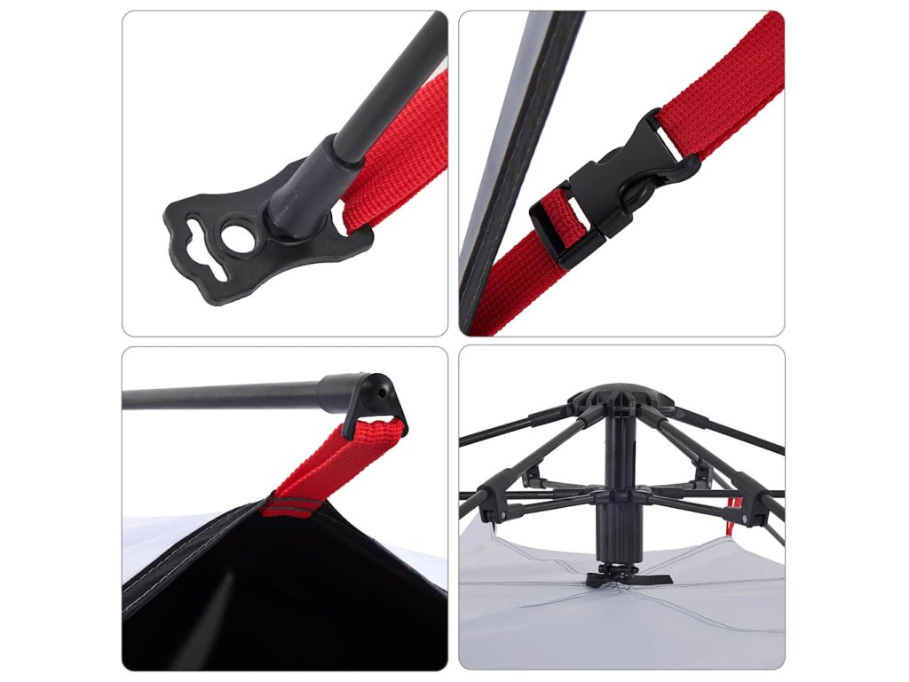 - Rychloupínací systém: Postavte stan snadno a bez námahy pomocí rychloupínacího systému! Stan položte na zem, roztáhněte předem sestavené tyče, dokud nezapadnou na své místo, a vše je hotovo!