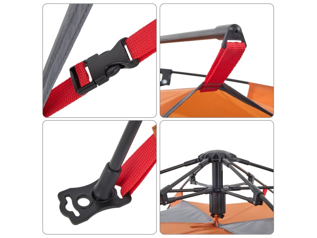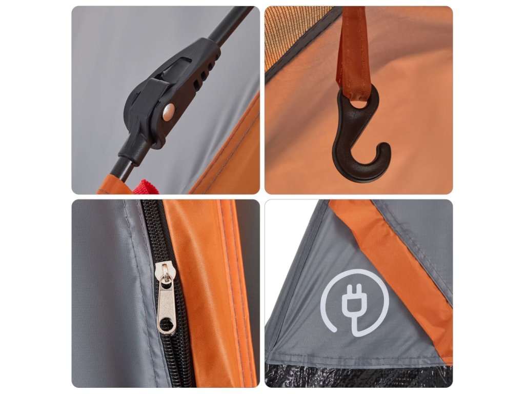 - Rychloupínací systém: Postavte stan snadno a bez námahy pomocí rychloupínacího systému! Stan položte na zem, roztáhněte předem sestavené tyče, dokud nezapadnou na své místo, a vše je hotovo!