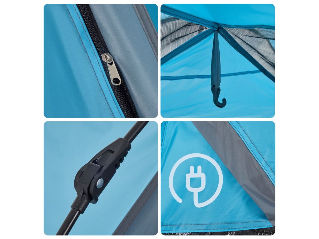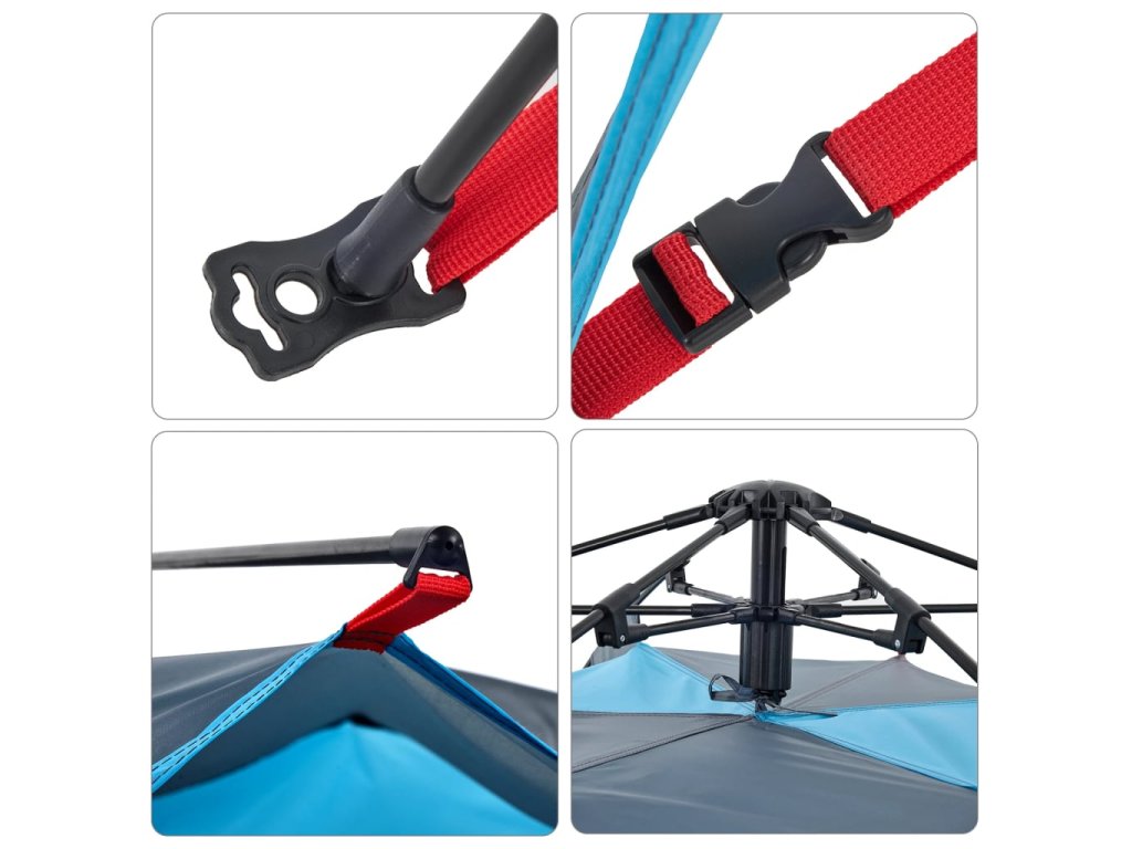 - Rychloupínací systém: Postavte stan snadno a bez námahy pomocí rychloupínacího systému! Stan položte na zem, roztáhněte předem sestavené tyče, dokud nezapadnou na své místo, a vše je hotovo!
