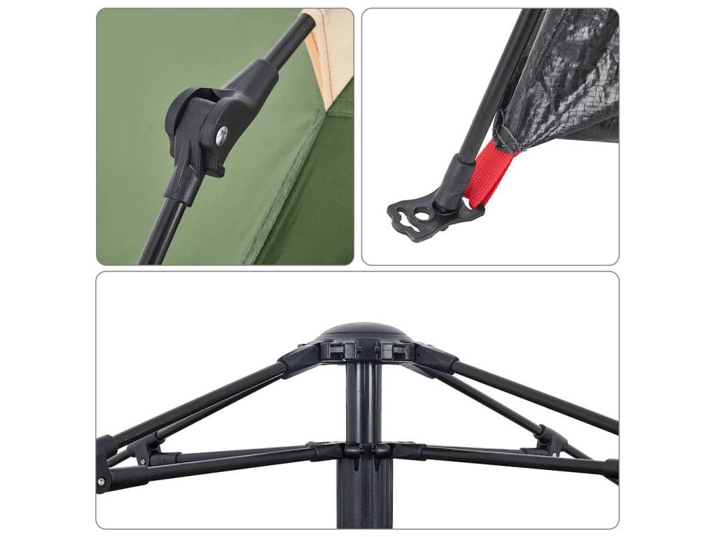 - Rychloupínací systém: Postavte stan snadno a bez námahy pomocí rychloupínacího systému! Stan položte na zem, roztáhněte předem sestavené tyče, dokud nezapadnou na své místo, a vše je hotovo!