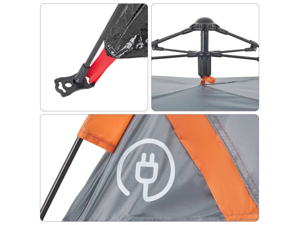 - Rychloupínací systém: Postavte stan snadno a bez námahy pomocí rychloupínacího systému! Stan položte na zem, roztáhněte předem sestavené tyče, dokud nezapadnou na své místo, a vše je hotovo!