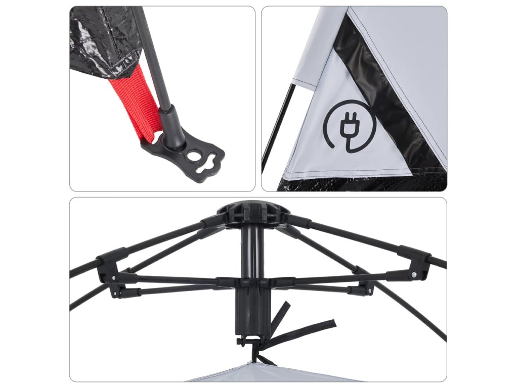 - Rychloupínací systém: Postavte stan snadno a bez námahy pomocí rychloupínacího systému! Stan položte na zem, roztáhněte předem sestavené tyče, dokud nezapadnou na své místo, a vše je hotovo!