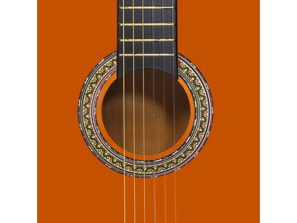 Tato kytara je vyrobená z masivního lipového dřeva s tvrdými plastovými knoflíky a hmatníkem. Hodnota tohoto nástroje spočívá ve vynikající kvalitě zvuku a krásném klasickém designu. Lehký obal je vyrobený z textilu, který je odolný proti povětrnostním vlivům a nabízí vaší kytaře vynikající ochranu. Kytaru v obalu s popruhem si můžete vzít kamkoli sebou.