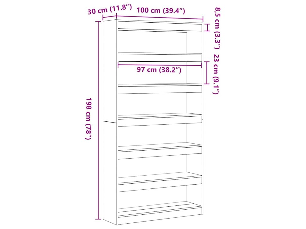 Tahle moderní knihovna vám nabídne super praktické řešení pro úložné prostory, a to v jakékoli místnosti. Je navržená s důrazem na jednoduchost a praktičnost, má čisté linie a vypadá dobře v jakémkoli interiéru. S rozměry 100 x 30 x 198 cm je to centrální kousek, co uspořádá vaši sbírku knih, dekorace nebo vzpomínky pěkně a s elegancí. Obdélníkový tvar zajišťuje stabilitu, a díky zpracování z kompozitního dřeva si udrží svůj vzhled.