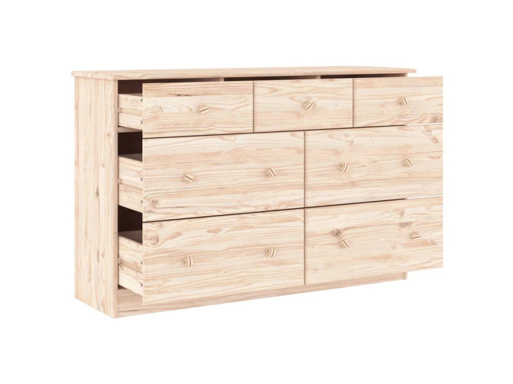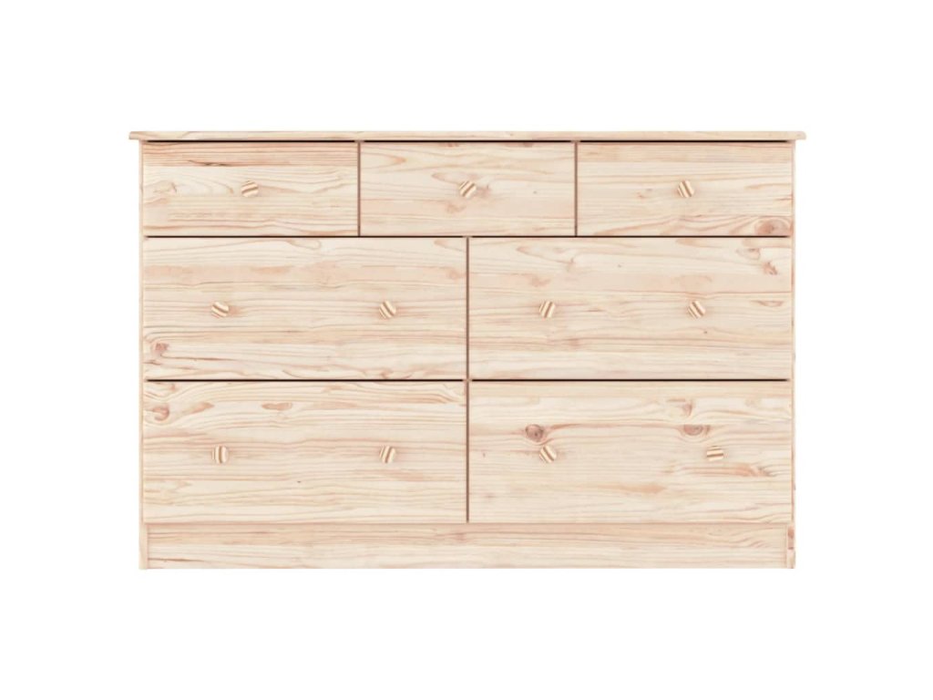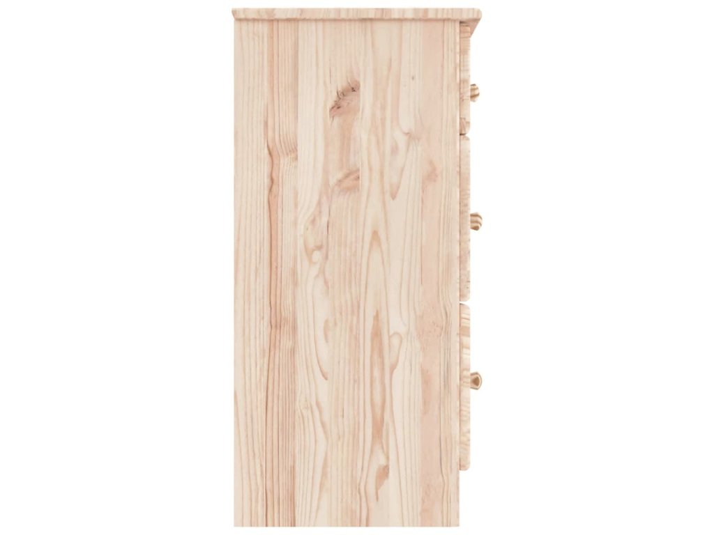- Masivní borové dřevo: Masivní borové dřevo je krásný přírodní materiál. Borové dřevo má rovnou kresbu a obsahuje suky, které materiálu dodávají jeho charakteristický, rustikální vzhled. Komoda je vyrobena z masivního borového dřeva a je odolná a robustní.