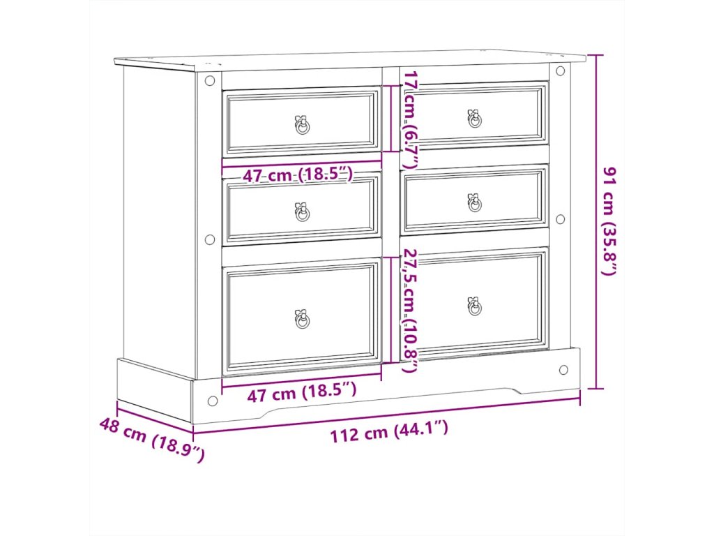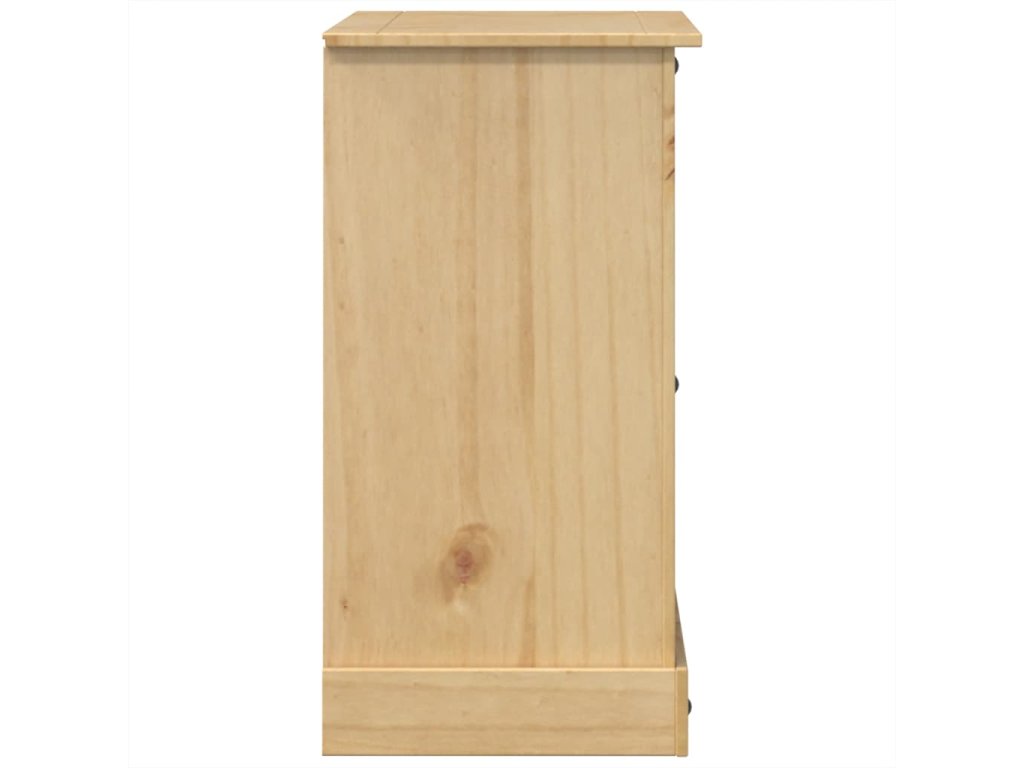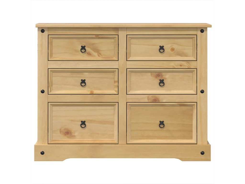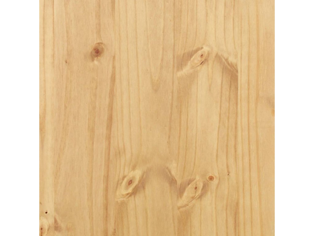 - Masivní borové dřevo: Masivní borové dřevo je krásný přírodní materiál. Borové dřevo má rovnou kresbu a obsahuje suky, které materiálu dodávají jeho charakteristický, rustikální vzhled. Komoda je vyrobena z masivního borového dřeva a je odolná a robustní.