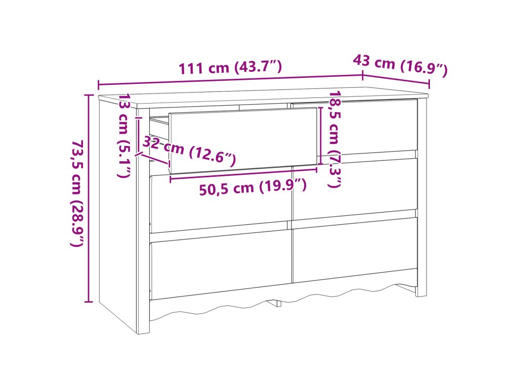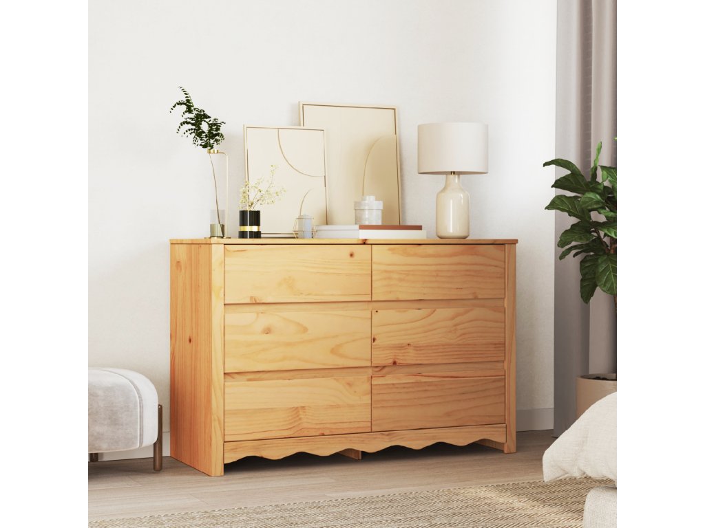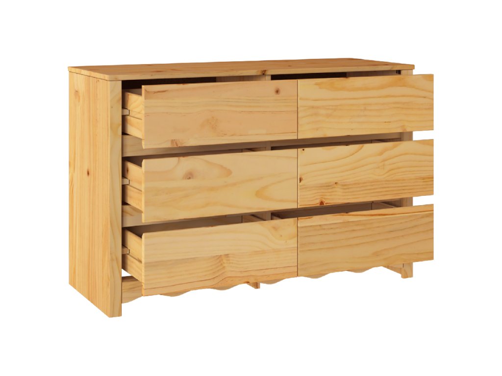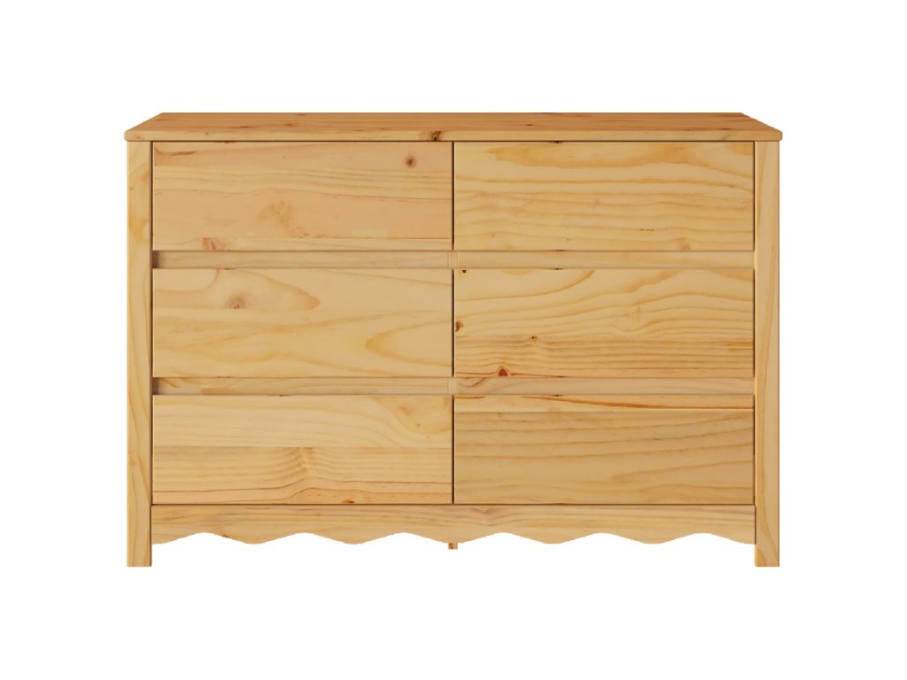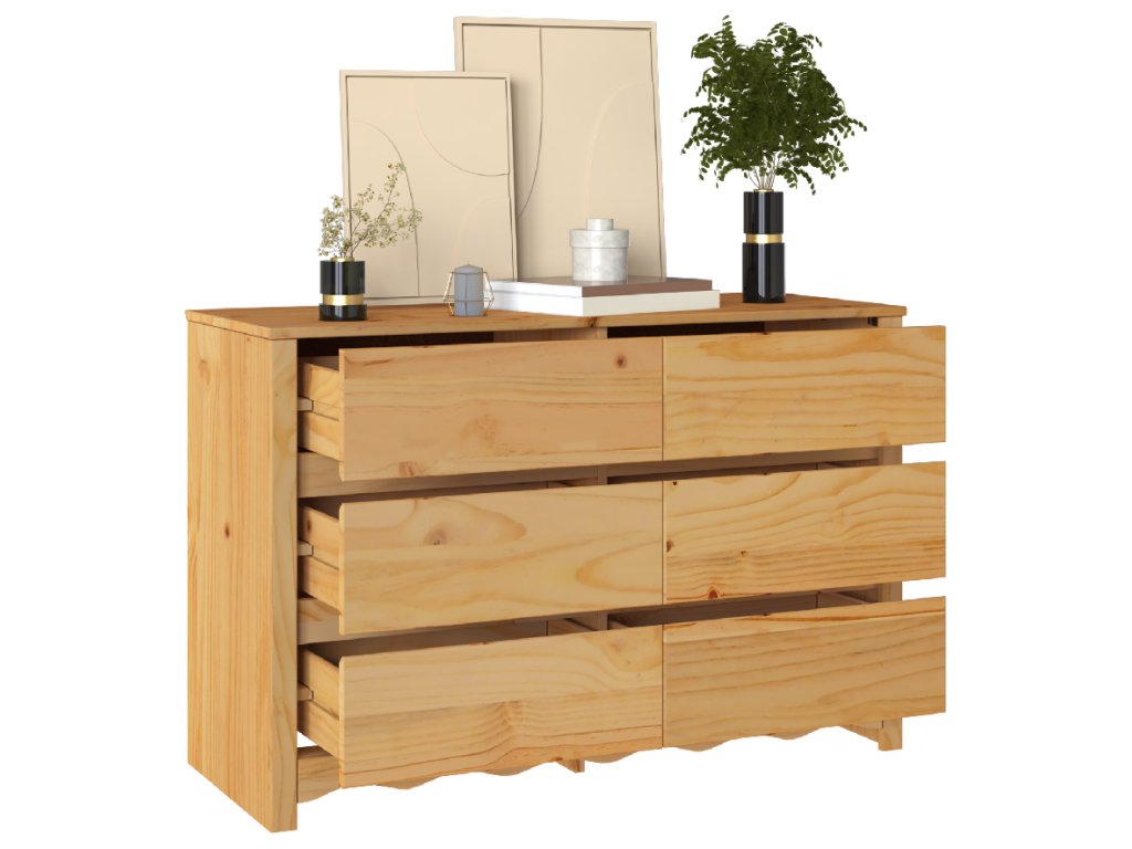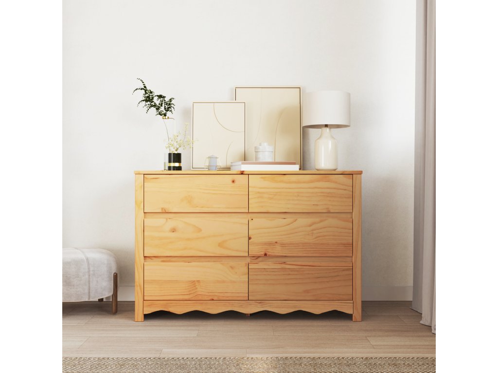 Tato stylová komoda má čistý a elegantní design, skvělá pro ty, co mají rádi praktické věci se špetkou stylu. Dává se s šesti prostornýma zásuvkama z masivního dubu, ideální pro uložení oblečení a osobních věcí v ložnicích nebo chodbách.