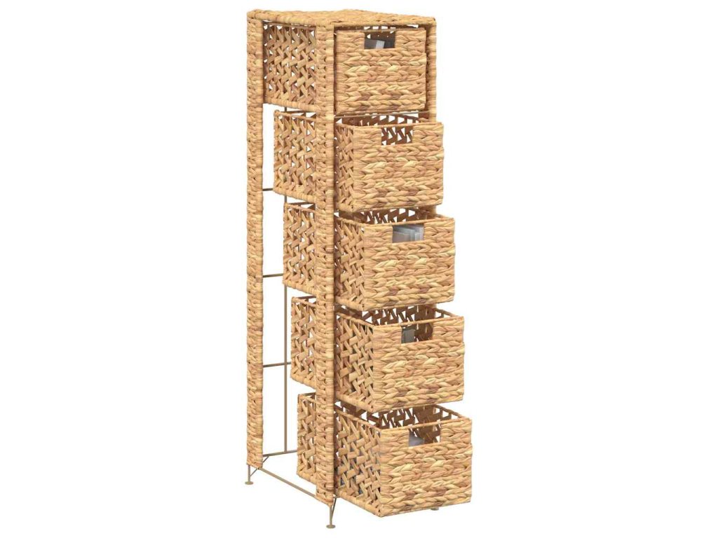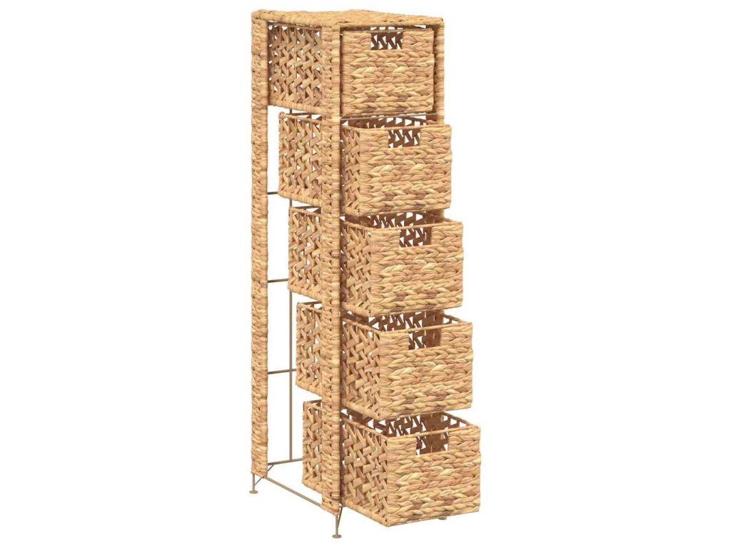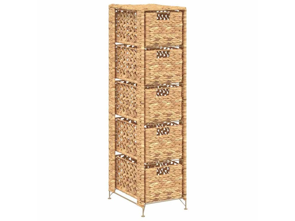 Má 5 zásuvek, které vám poskytnou bohatý prostor pro nejrůznější drobnosti. Komoda se skládá z kovového rámu a vodního hyacintu, díky čemuž je robustní a odolná. Atraktivní proutěný styl zvýrazňuje rustikální kouzlo komody.
