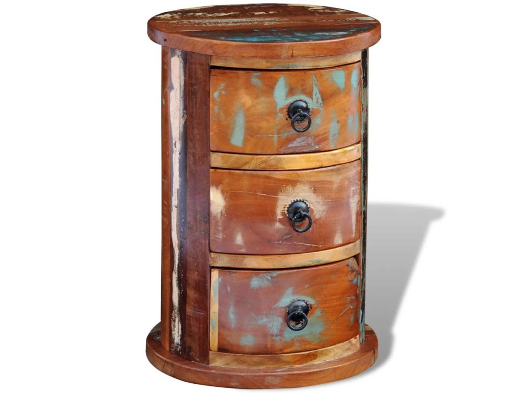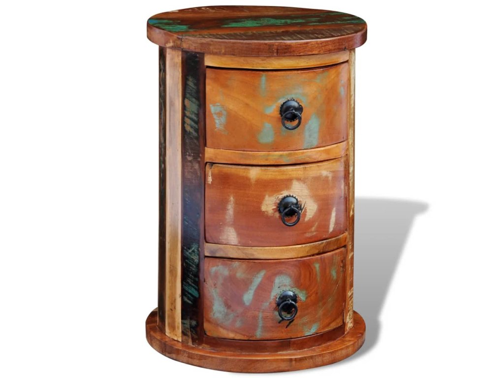 Tato dřevěná kulatá skříňka ve starožitném stylu je vybavena 3 zásuvkami, které poskytují spoustu úložného prostoru, takže vám zajisté pomůže udržet pořádek ve vašich věcech. Na hladkou horní plochu můžete také vystavit pěkné vázy nebo dekorace. Pomocí železnými knopkami a kroužků se zásuvky velmi snadno vytahují.