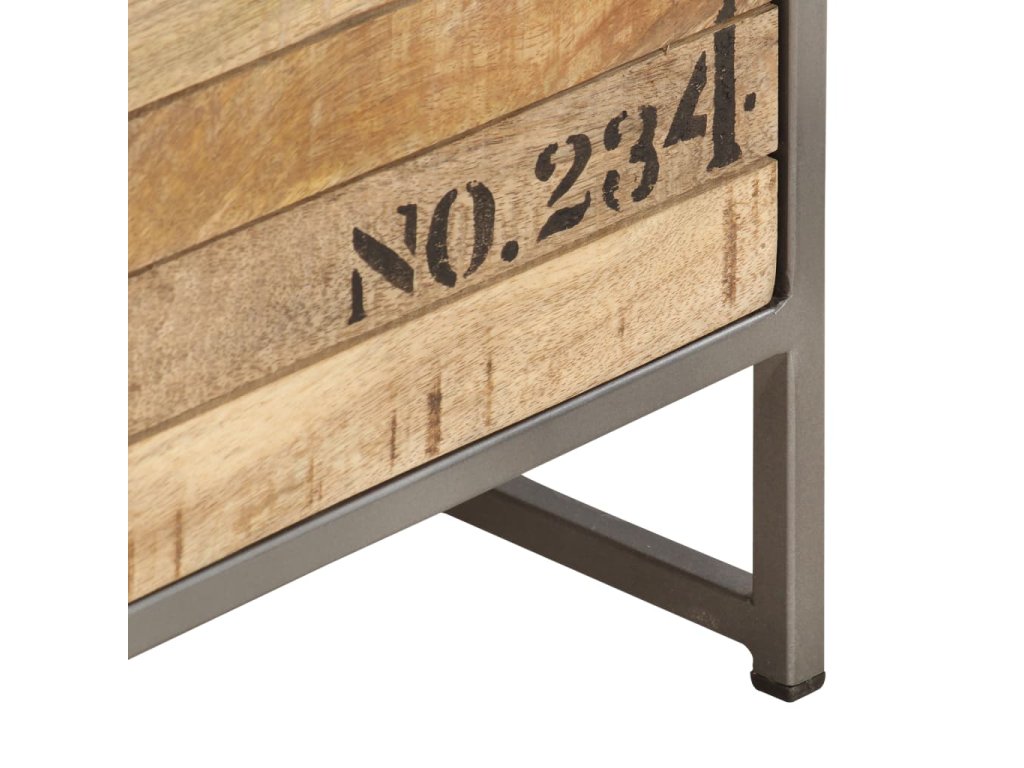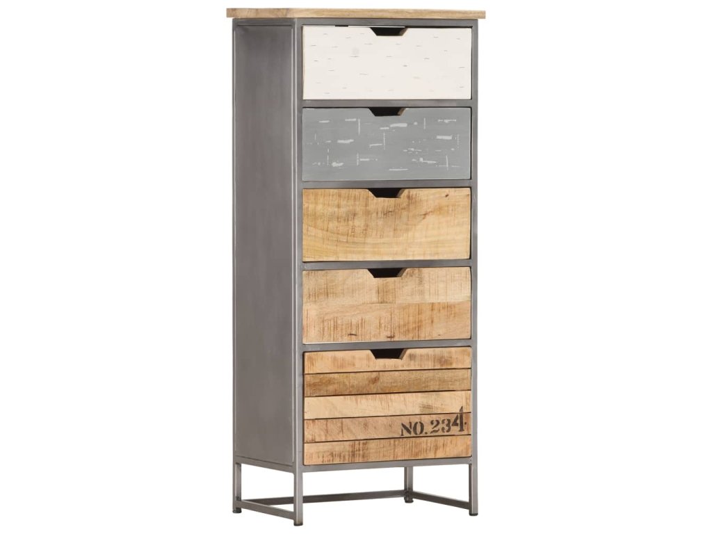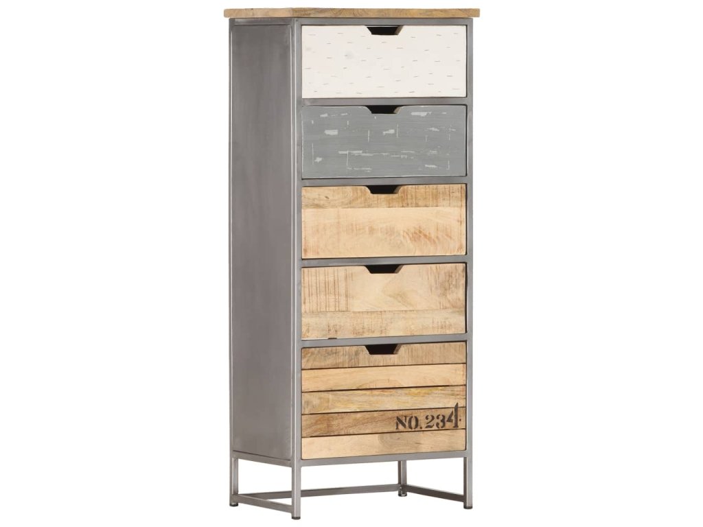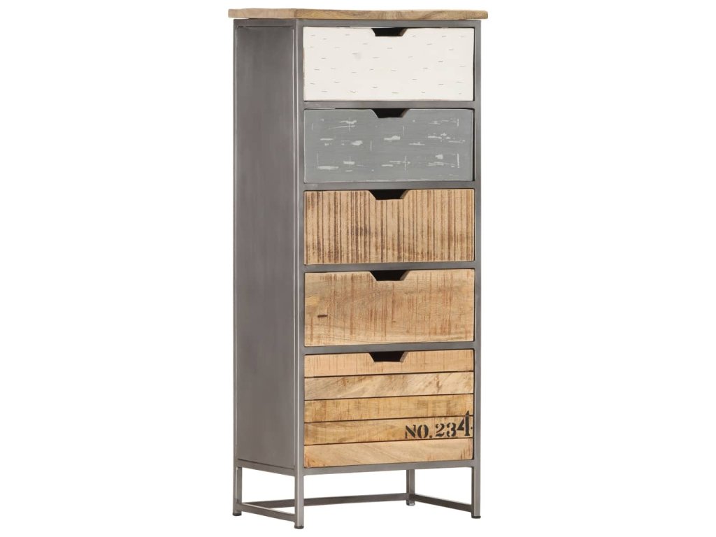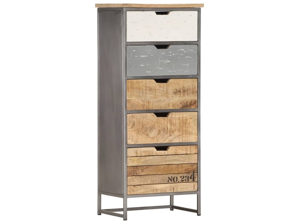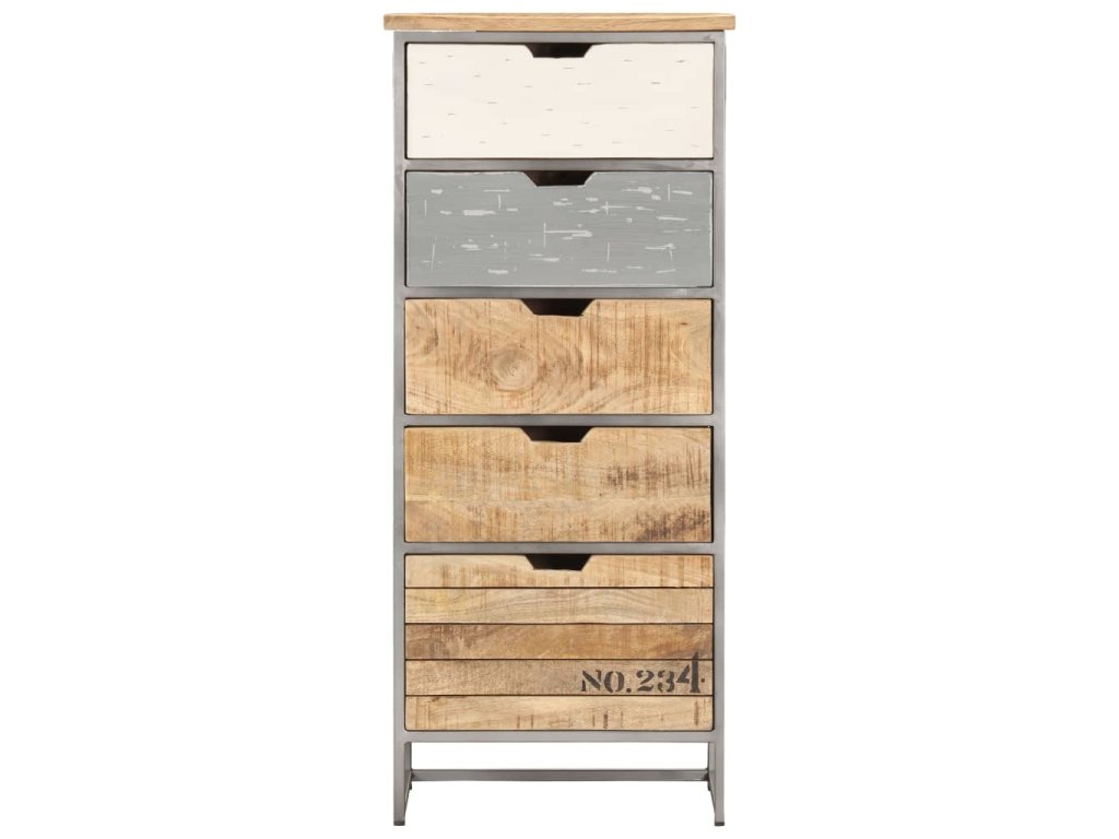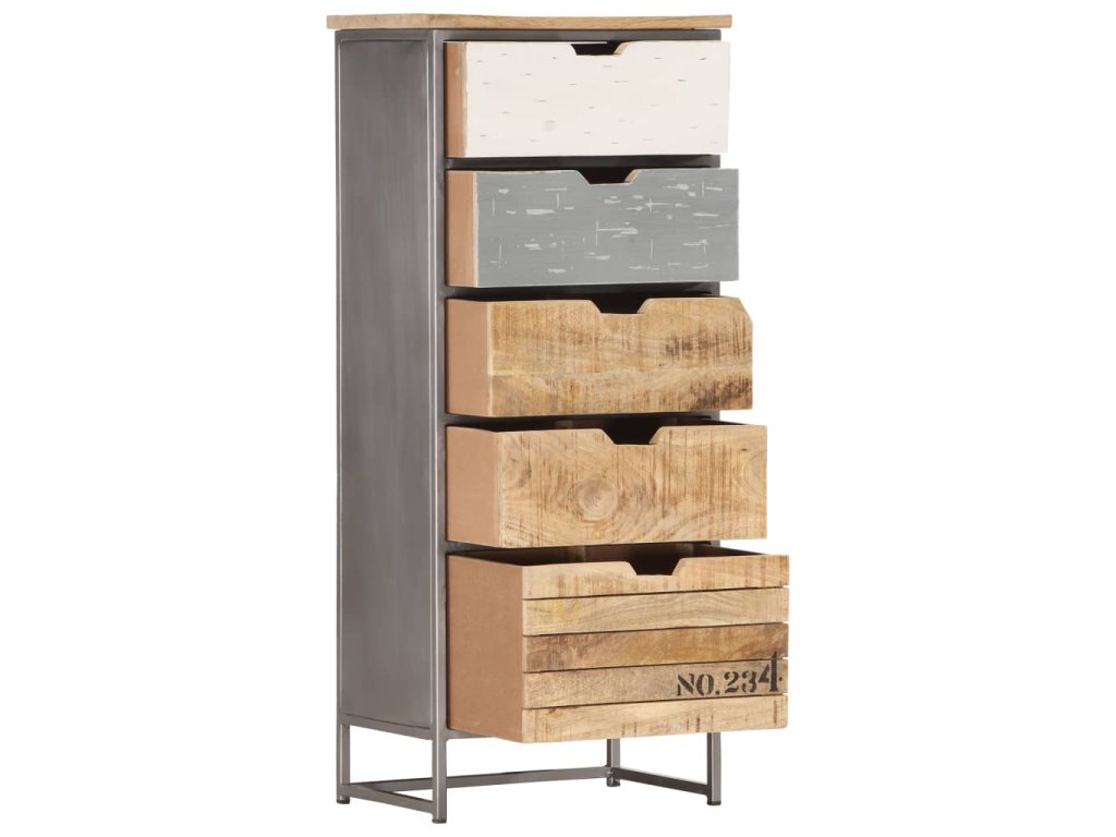 Komoda se zásuvkami je vyrobená z masivního mangovníku, což je tvrdé dřevo s hustou texturou. Hrubé mangovníkové dřevo je nejen schopné unést značnou váhu, ale výborně také odolává opotřebení a působení času. Odkládací skříňka s překrásným designem je proto stabilní, odolná a na pohled atraktivní. Zručné zpracování a nádherná kresba dřeva propůjčují každému kusu nábytku jeho jedinečný a od všech ostatních lehce odlišný charakter. Železné úchytky umocňují industriální vzezření úložné skříňky. V příborníku je 5 zásuvek, poskytne vám tedy spoustu místa, kam si můžete ukládat své oblečení, knížky a všelijaké další věci. Sestavení komody se zásuvkami je snadné.
