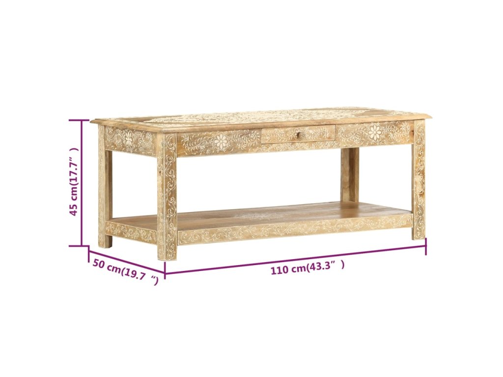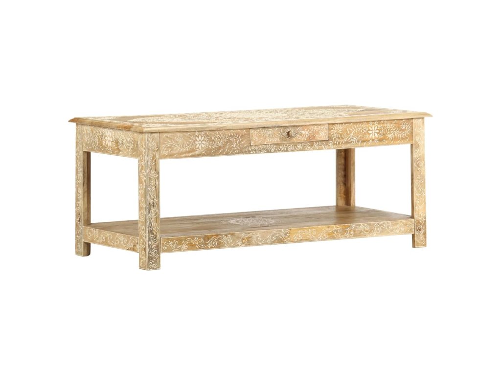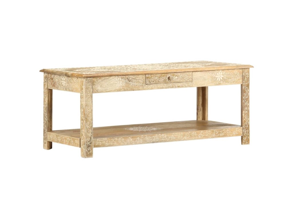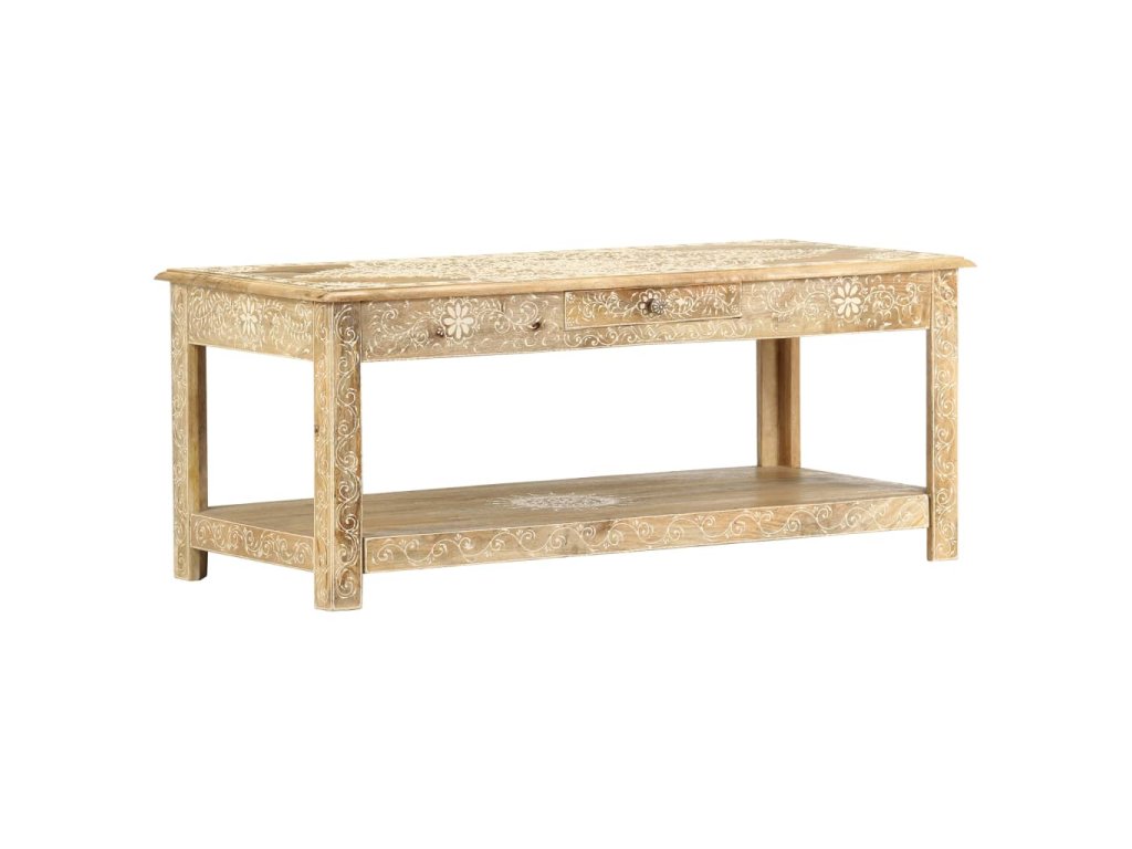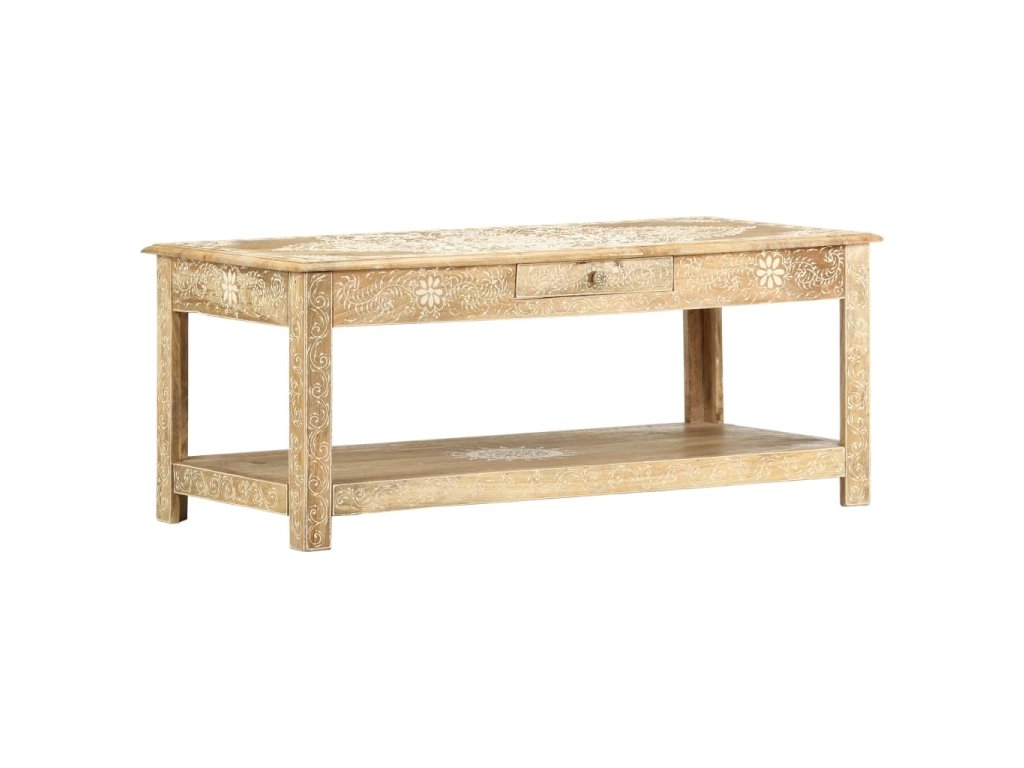 Konferenční stolek je vyrobený z masivního mangovníkového dřeva, které je nejen stabilní a odolné, ale zároveň také krásně vypadá. Navíc ho zdobí ručně malovaný vzor a zručné řemeslné zpracování podtrhuje jeho působivý retro styl. Každá fáze výrobního procesu je prováděná s mimořádnou péčí, ať už se jedná o leštění nebo lakování. Rukodělné provedení a překrásná kresba dřeva dávají každému kusu nábytku zcela jedinečný charakter, jímž se lehce liší od všech ostatních. Velká spodní přihrádka a malá prostřední zásuvka vám poskytnou dodatečný prostor k uložení nejrůznějších věcí. Dřevěný povrch s ozdobnými ornamenty přidává stolu na eleganci. Sestavení konferenčního stolku je jednoduché.