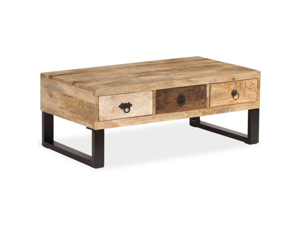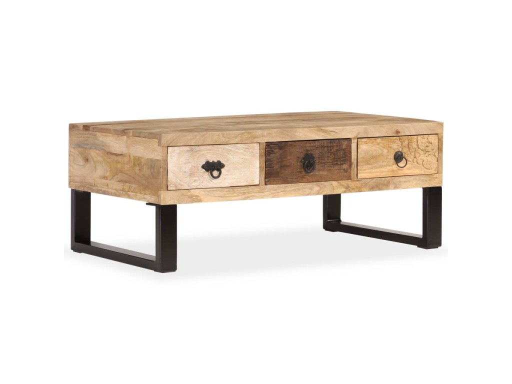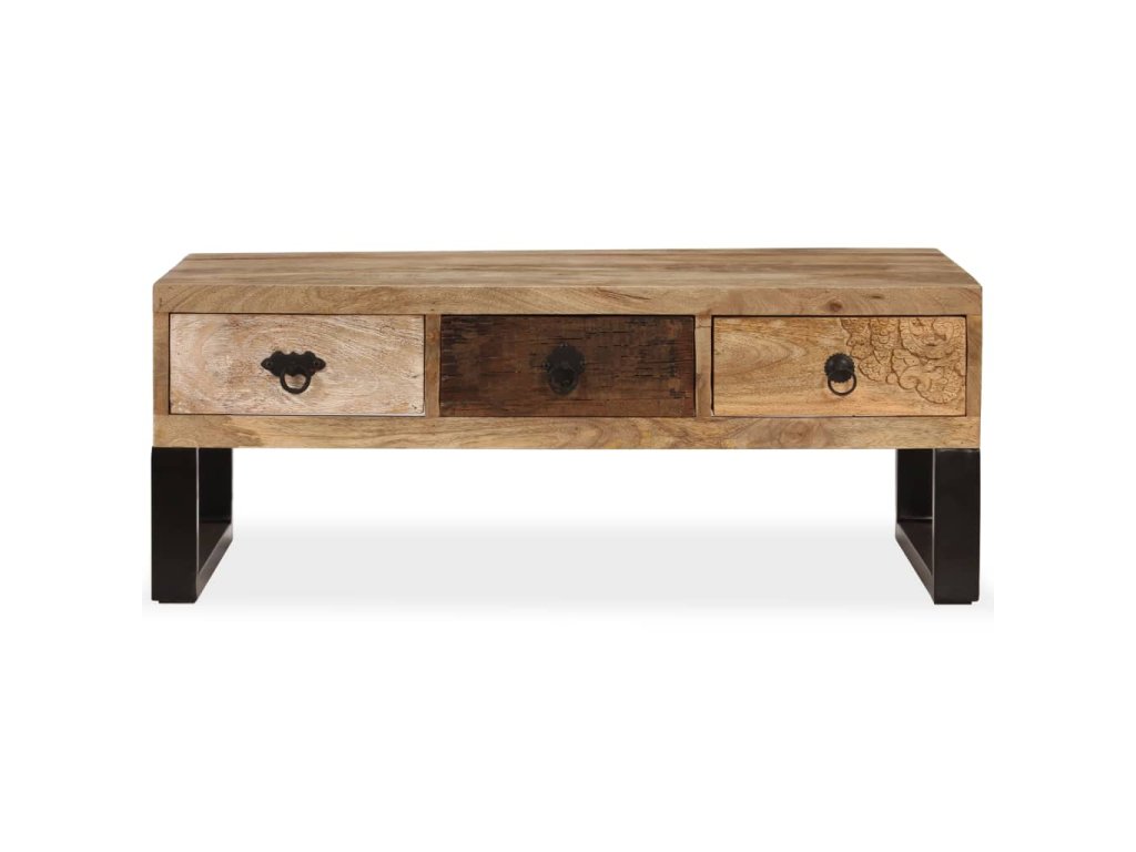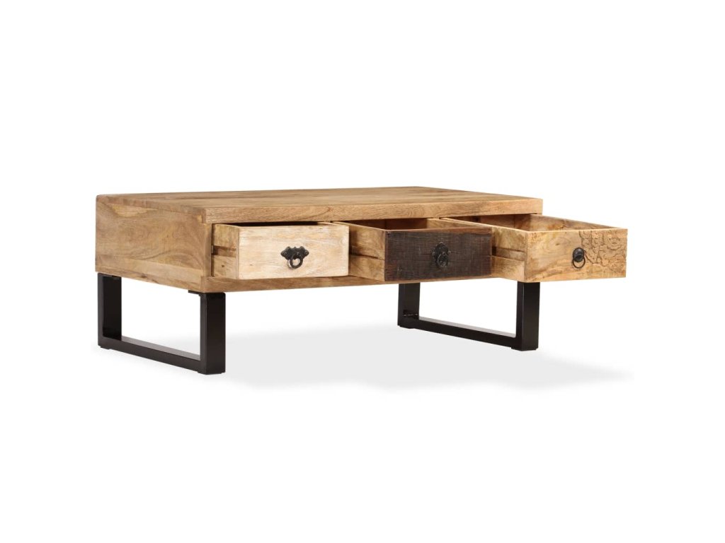 Konferenční stolek je ručně vyroben z masivního mangovníkového dřeva, které je pevné, stabilní, odolné a krásné. Řemeslné zpracování přispívá k jeho okázalému retro stylu. Každý výrobní krok je prováděn s největší péčí, ať už jde o leštění, natírání nebo lakování. Řemeslné zpracování a krásná struktura dřeva činí každý kus nábytku unikátní a mírně odlišný od všech ostatních. Pevná stolní deska se výborně hodí k odkládání jídla a pití, k umístění lampičky či k vystavení jiných dekorativních předmětů. Tento konferenční stolek je vybaven třemi zásuvkami, které vám poskytují další úložný prostor k uschování maličkostí, jako jsou klíče, zápisníčky, psací potřeby, dálkové ovladače a další drobnosti, které chcete mít po ruce. Ocelové nohy přispívají nejen ke stabilitě stolu, ale i k jeho působivému industriálnímu vzhledu. Montáž je snadná.
