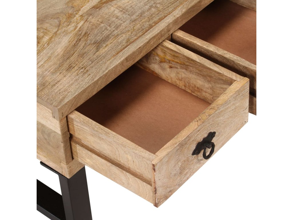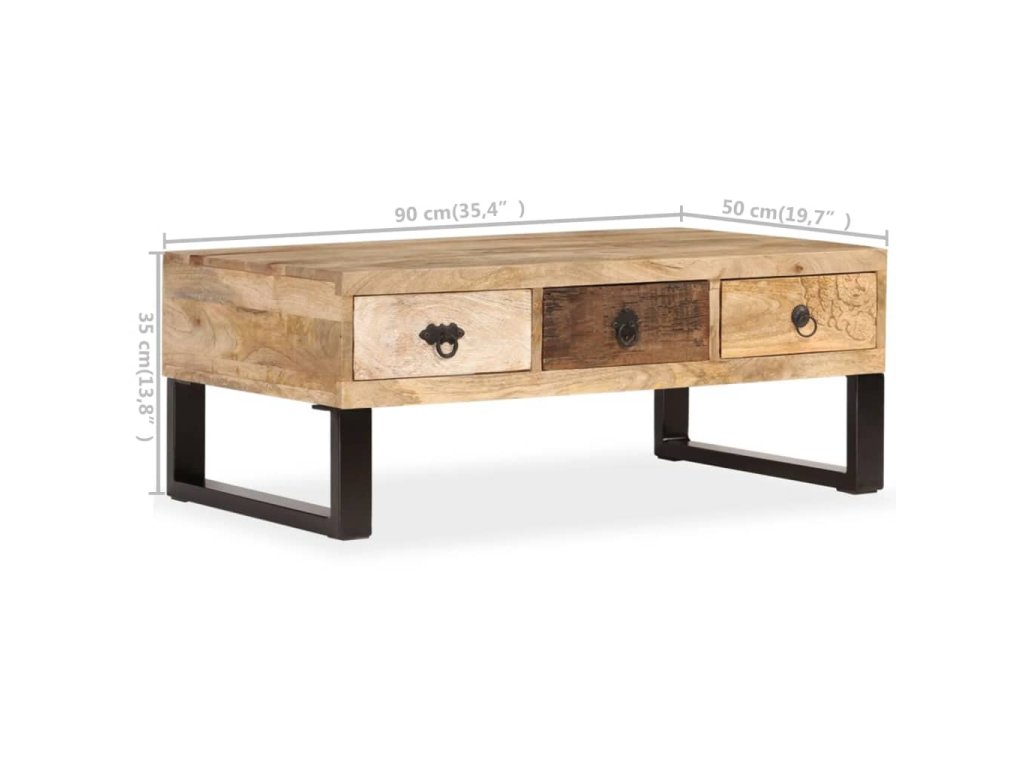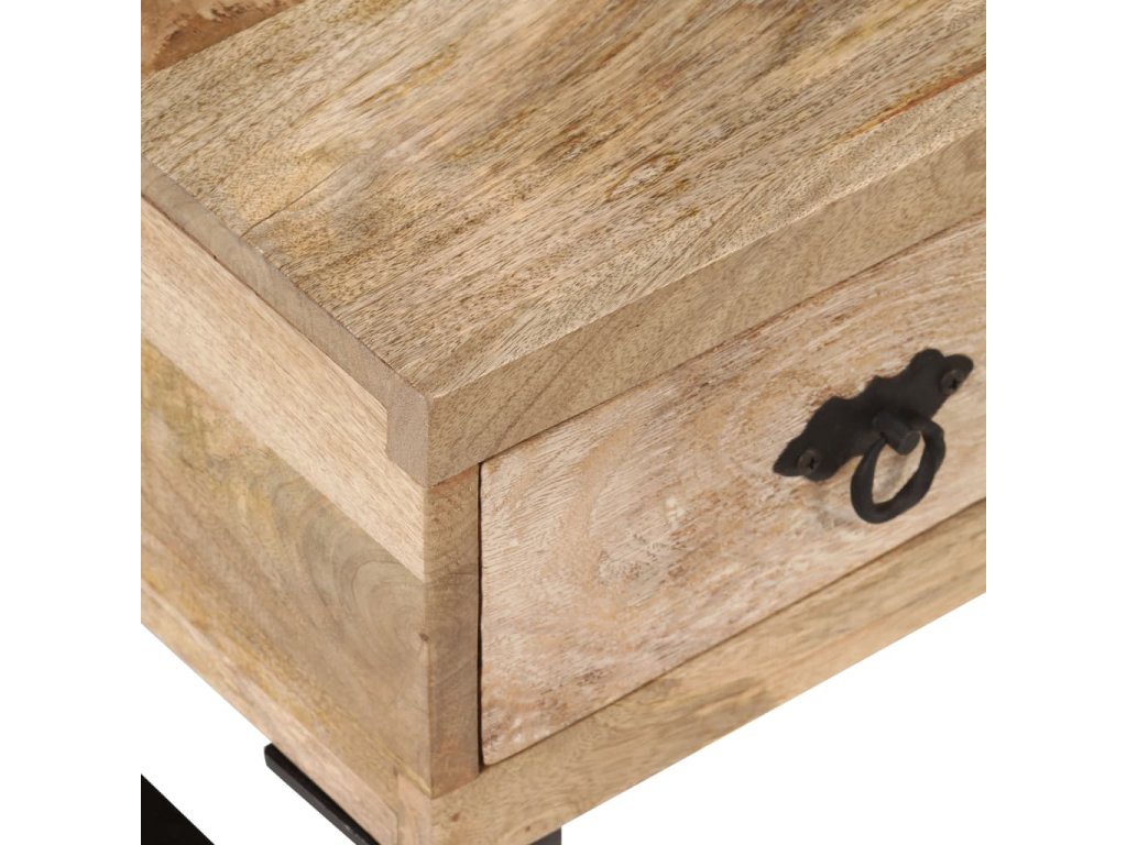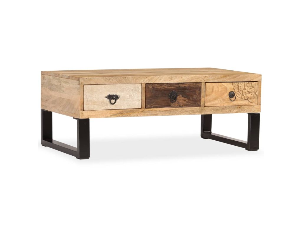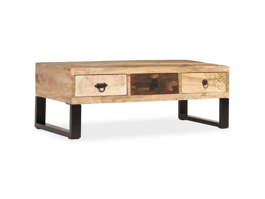 Konferenční stolek je ručně vyroben z masivního mangovníkového dřeva, které je pevné, stabilní, odolné a krásné. Řemeslné zpracování přispívá k jeho okázalému retro stylu. Každý výrobní krok je prováděn s největší péčí, ať už jde o leštění, natírání nebo lakování. Řemeslné zpracování a krásná struktura dřeva činí každý kus nábytku unikátní a mírně odlišný od všech ostatních. Pevná stolní deska se výborně hodí k odkládání jídla a pití, k umístění lampičky či k vystavení jiných dekorativních předmětů. Tento konferenční stolek je vybaven třemi zásuvkami, které vám poskytují další úložný prostor k uschování maličkostí, jako jsou klíče, zápisníčky, psací potřeby, dálkové ovladače a další drobnosti, které chcete mít po ruce. Ocelové nohy přispívají nejen ke stabilitě stolu, ale i k jeho působivému industriálnímu vzhledu. Montáž je snadná.