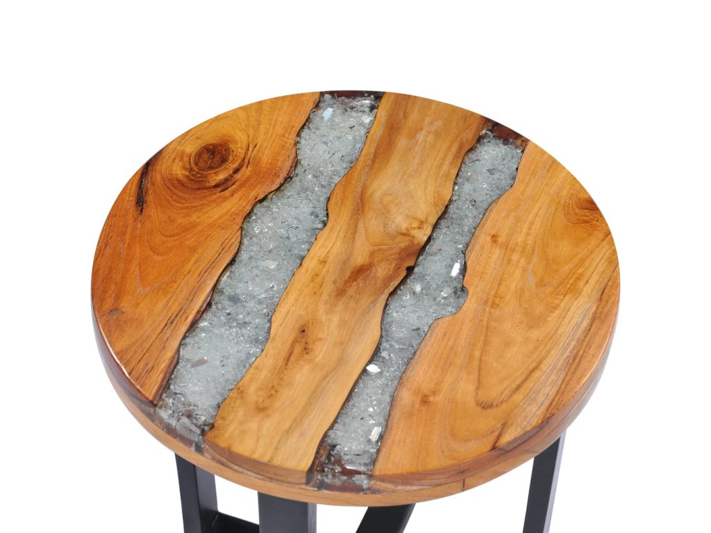 - Materiál stolní desky: masivní teakové dřevo s čirým lakovaným povrchem + průhledný polyresin s drceným sklem