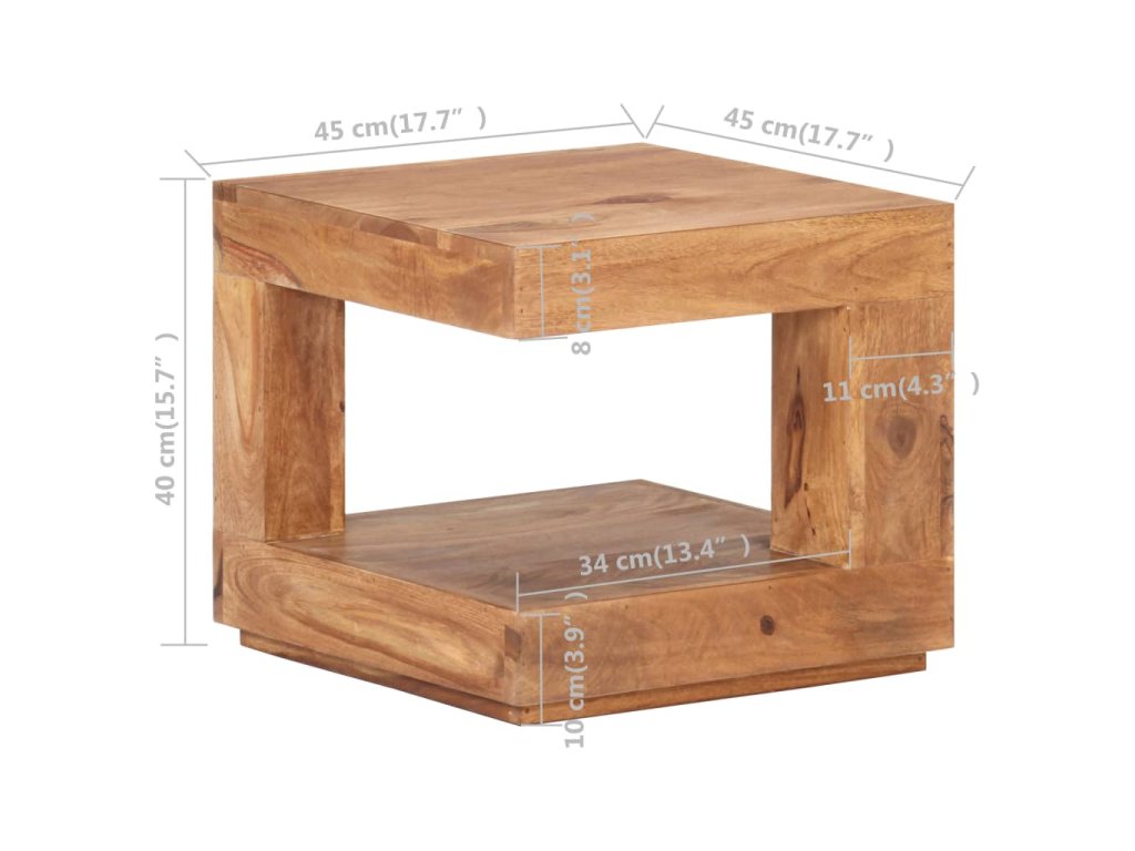 Tento odkládací stolek je zhotovený z masivního akáciového dřeva, což je nádherný přírodní materiál. Akáciové dřevo je tropické tvrdé dřevo, které má hustou strukturu a je pevné a odolné. Tento akcentový stolek je vybaven jednou poličkou, poskytuje tedy dostatek úložného prostoru pro přehledné uspořádání vašich nezbytností na dosah ruky. Tento dřevěný stolek navíc můžete používat jako stolek ke gauči, koncový stolek nebo stolek do obývacího pokoje.