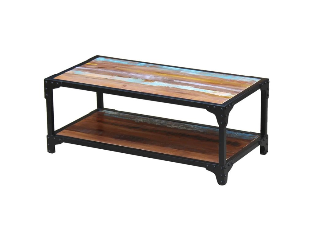 Dřevěný konferenční stolek ve vintage stylu, vyrobený z masivního recyklovaného dřeva, bude ve vaší domácnosti nadčasovým kusem nábytku. Díky svému pevnému ocelovému rámu je tento stolek velmi stabilní a odolný. Stolní deska poskytuje stabilní a bezpečnou plochu k odkládání nápojů, košíků s ovocem, váz či dalších dekorativních předmětů. Police na jeho spodní straně poskytuje spoustu místa na ukládání multimediálních přehrávačů, knih, časopisů a dalších věcí, které chcete mít pro ruce. Můžete ho používat také jako stolek ke gauči, stolek do obývacího pokoje, odkládací stolek apod.