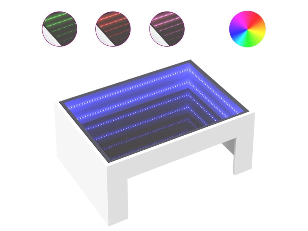 - RGB LED světla pro příjemnou atmosféru: Tento stolek je vybaven LED osvětlením, které lze snadno nastavit a vytvořit tak individuální světelnou atmosféru. Umožňuje přizpůsobit režimy, barvy a jas, abyste si vytvořili příjemnou atmosféru svého interiéru.