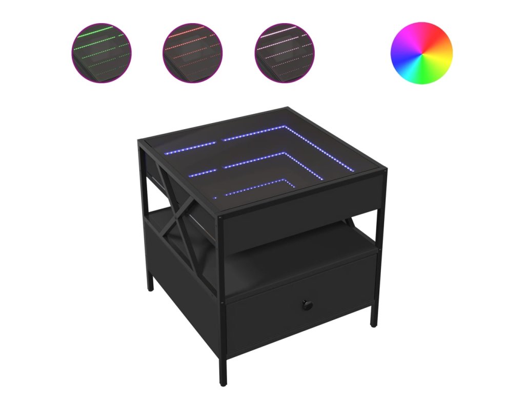 - RGB LED světla pro příjemnou atmosféru: Tento stolek je vybaven LED osvětlením, které lze snadno nastavit a vytvořit tak individuální světelnou atmosféru. Umožňuje přizpůsobit režimy, barvy a jas, abyste si vytvořili příjemnou atmosféru svého interiéru.