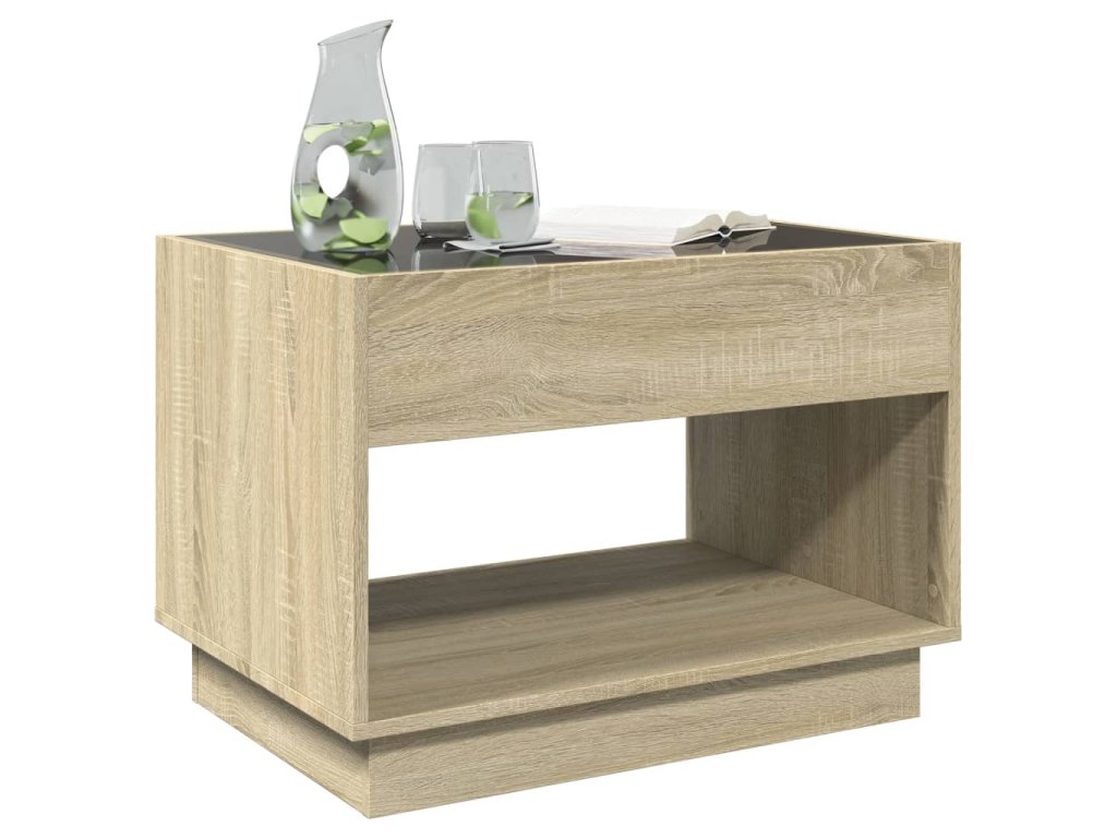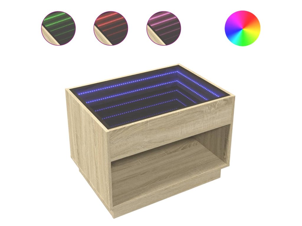- RGB LED světla pro příjemnou atmosféru: Tento stolek je vybaven LED osvětlením, které lze snadno nastavit a vytvořit tak individuální světelnou atmosféru. Umožňuje přizpůsobit režimy, barvy a jas, abyste si vytvořili příjemnou atmosféru svého interiéru.