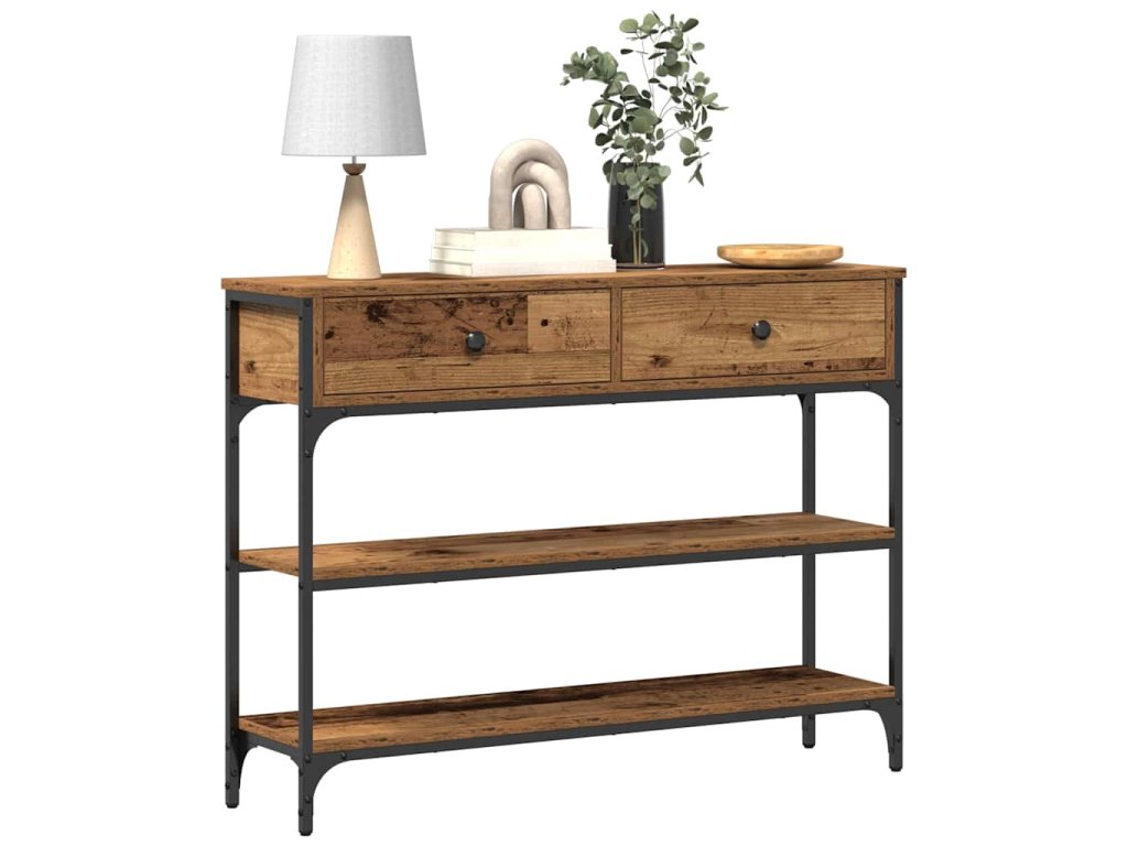 - Materiály: Tenhle konzolový stolek je z kompozitního dřeva a oceli, což mu dodává odolnou a esteticky příjemnou strukturu. Kompozitní dřevo dává hladký povrch a ocelový rám zaručuje dlouhou životnost a spolehlivost, ideální pro moderní interiéry.