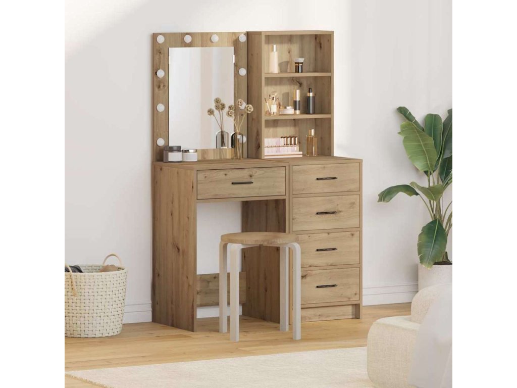 - Kompozitní dřevo Toaletní stolek je převážně vyroben z kvalitního kompozitního dřeva, což zajišťuje dobrou rovnováhu mezi vzhledem a pevností. Tento materiál se nekroutí a nepraská, takže si drží tvar i funkci, i když ho často používáš. Hladký povrch přidává elegantní a moderní nádech.