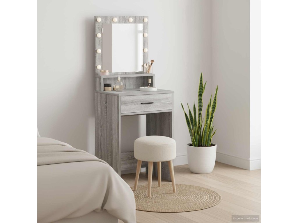 - Robustní konstrukce: Vyrobený z kompozitního dřeva, toaletní stolek zaručuje odolnost a spolehlivost. Silný rám unese každodenní používání a poskytuje stabilní povrch. Kompozitní dřevo zajišťuje spolehlivou oporu, zatímco lehká konstrukce usnadňuje přesun.