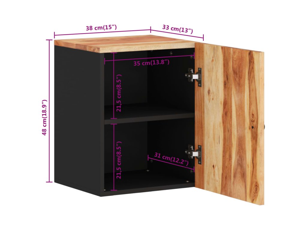 - Masivní akáciové dřevo: Tato nástěnná skříňka je vyrobena z masivního akáciového dřeva v kombinaci s kompozitním dřevem. Masivní akáciové dřevo je nádherný přírodní materiál. Akáciové dřevo je tropické tvrdé dřevo, které má hustou strukturu a je pevné a odolné.