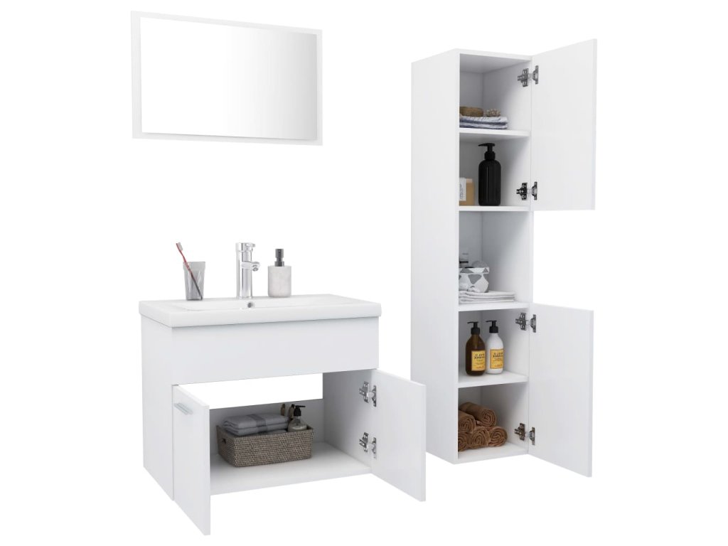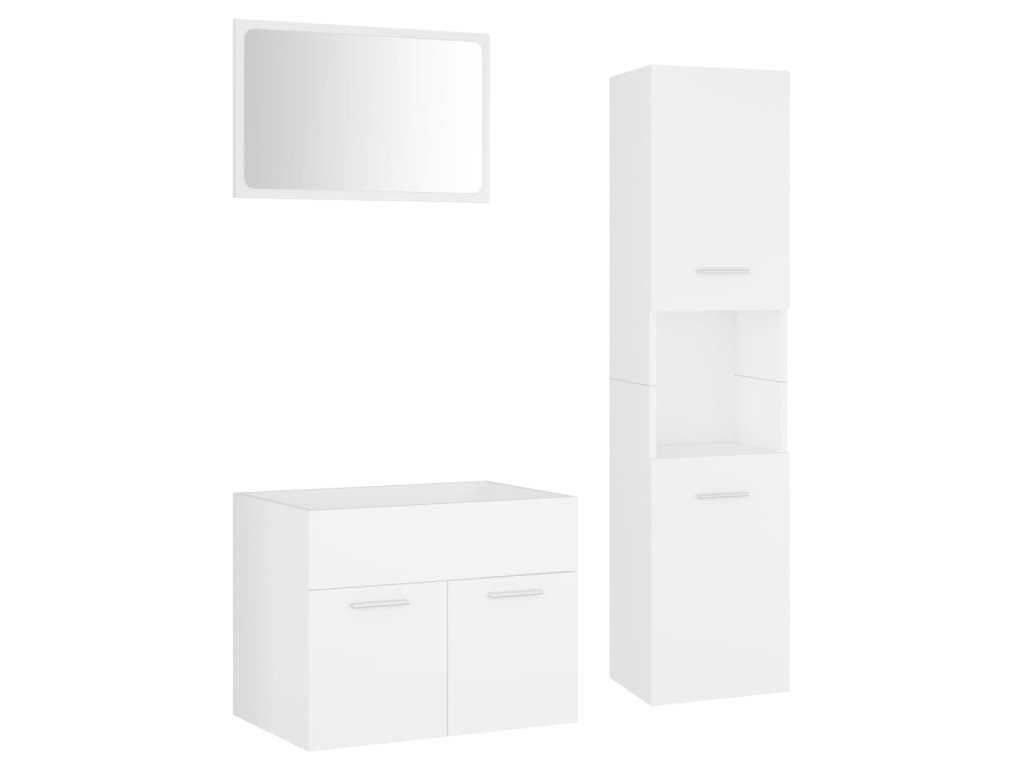 Sada nábytku obsahuje skříňku pod umyvadlo, vysokou skříň a zrcadlo. Stylová umyvadlová skříňka má 1 přihrádku a nahoře je ideálně uzpůsobená k umístění umyvadla. Ve vysoké skříni najdete za dvěma dvířky celkem 5 přihrádek, které vám poskytnou spoustu místa k uložení vašich věcí. Zrcadlo zase dodá vaší domácnosti nový půvab. Celý set koupelnového nábytku snadno očistíte navlhčeným hadříkem.