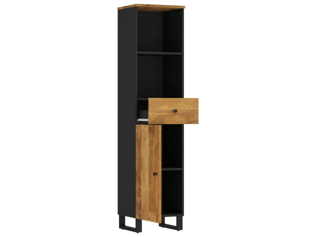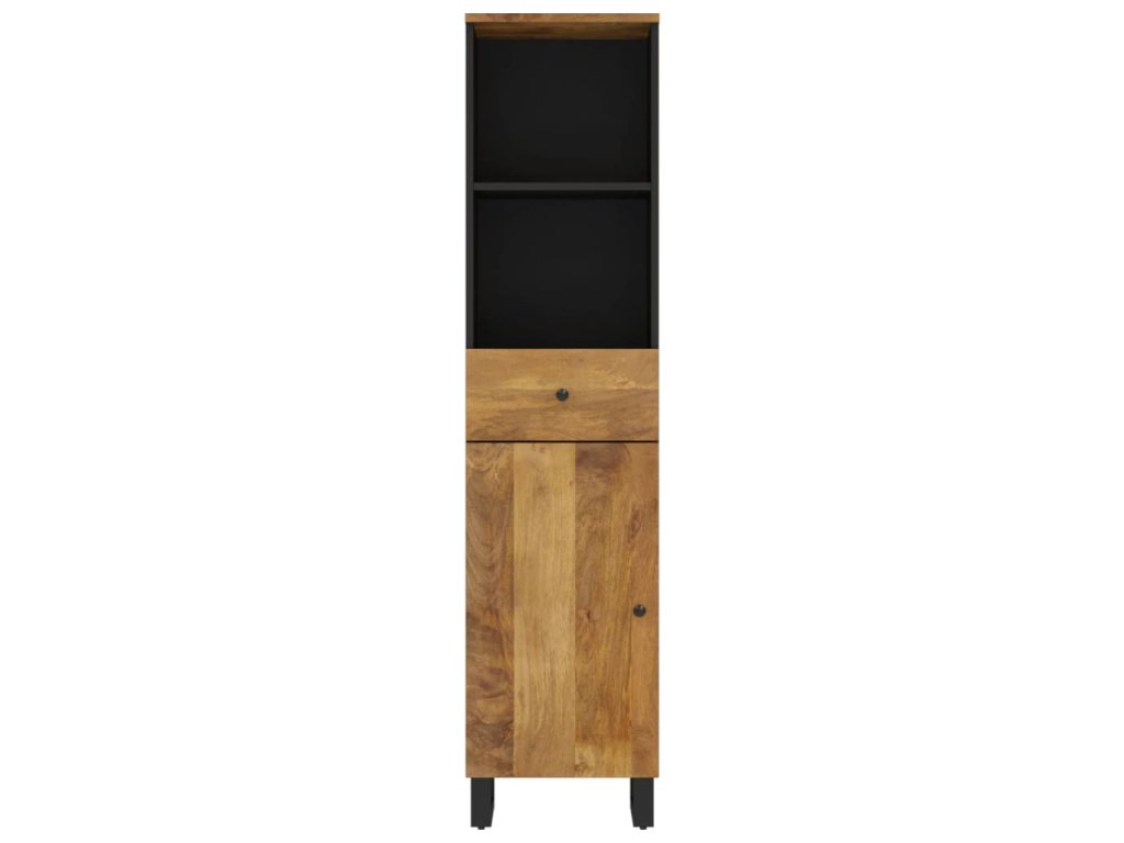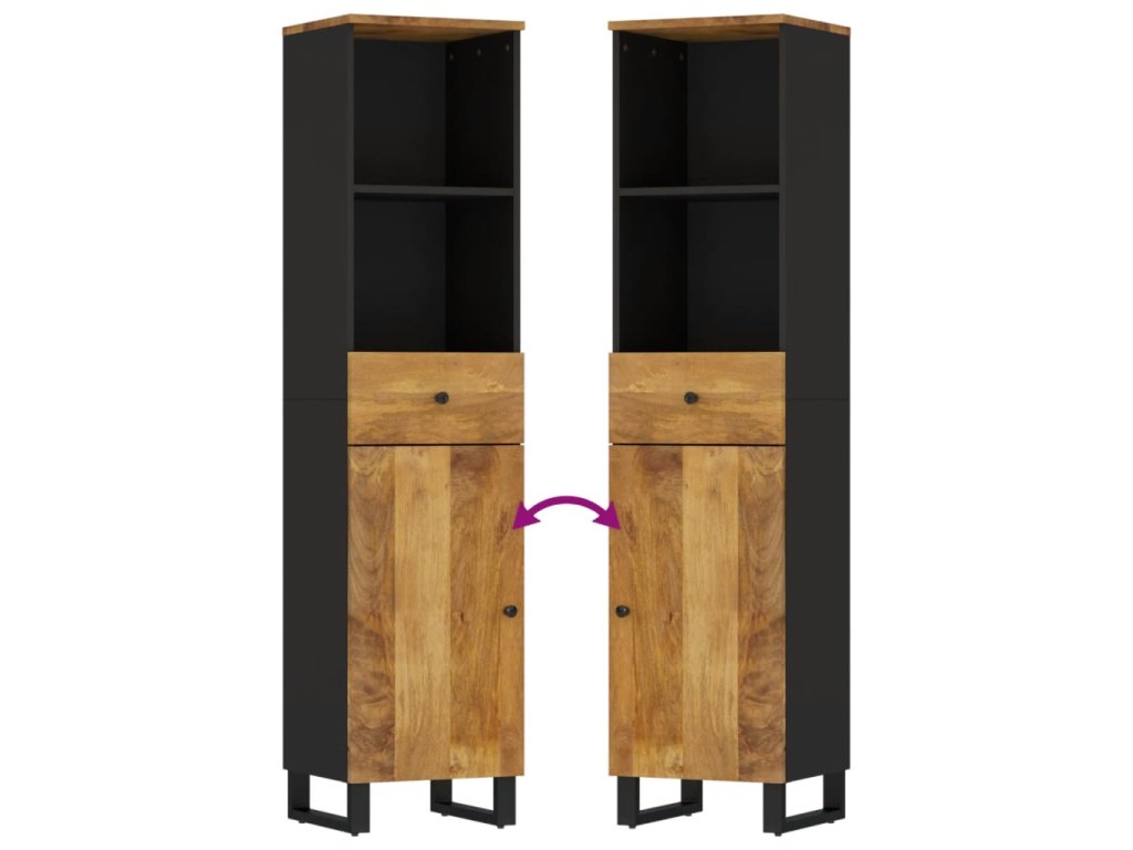 - Masivní mangovníkové dřevo: Tato koupelnová skříňka je vyrobena z masivního mangovníku v kombinaci s kompozitním dřevem. Masivní mangovníkové dřevo je pevné tropické tvrdé dřevo, ze kterého se vyrábí robustní nábytek. Krásná kresba dřeva propůjčuje každému kusu nábytku jeho jedinečný a od všech ostatních lehce odlišný vzhled.