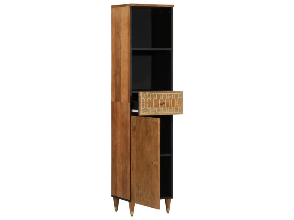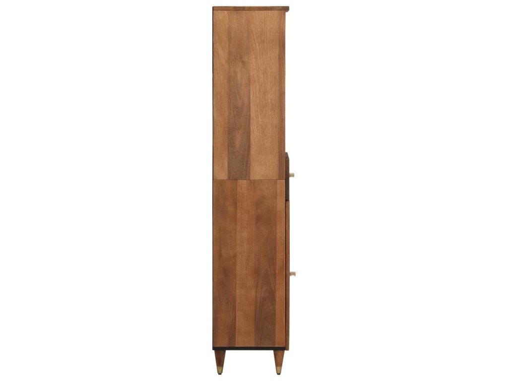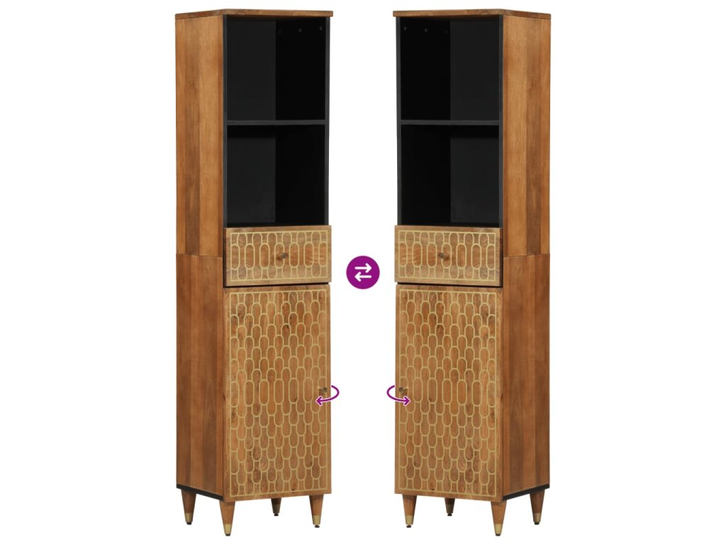 - Masivní mangovníkové dřevo: Masivní mangovníkové dřevo je pevné tropické tvrdé dřevo, ze kterého se vyrábí robustní nábytek. Krásná kresba dřeva propůjčuje každému kusu nábytku jeho jedinečný a od všech ostatních lehce odlišný vzhled. Úložná skříňka do koupelny je vyrobená z masivního mangovníkového dřeva, je tedy stabilní a odolná.