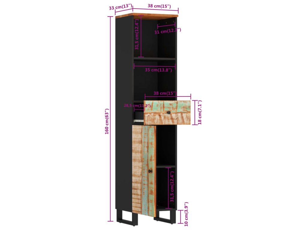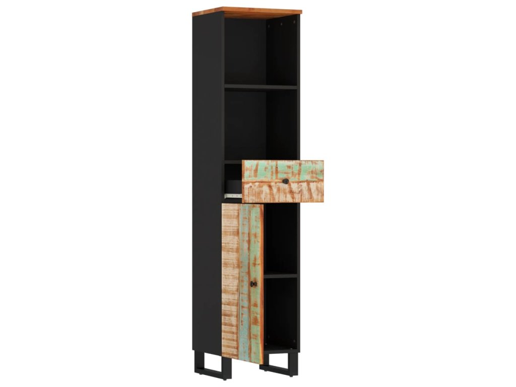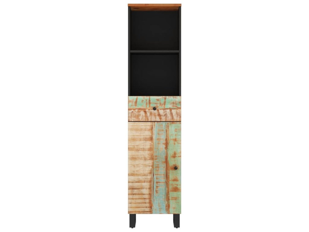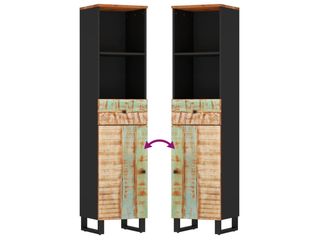 - Masivní recyklované dřevo: Tato koupelnová skříňka je vyrobena z masivního recyklovaného dřeva v kombinaci s kompozitním dřevem. Masivní recyklované dřevo se skládá z opakovaně použitých dřevin, jako je teak, mangovník, borovice a buk. Toto dřevo pochází ze starých staveb, jako jsou továrny, kůlny a lodě.